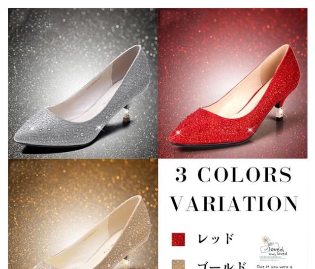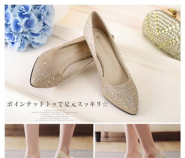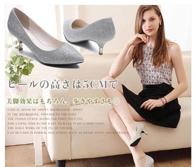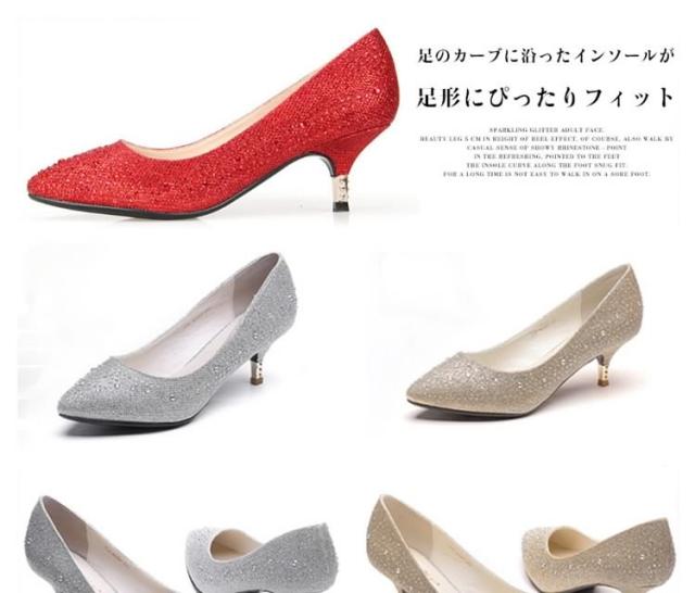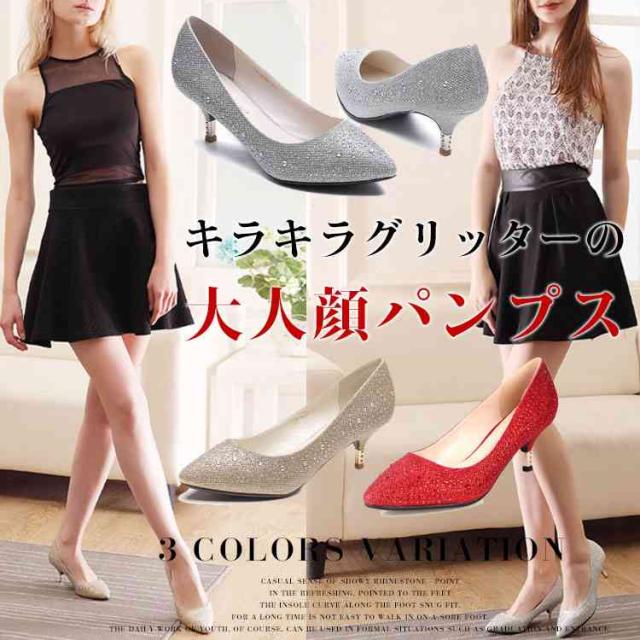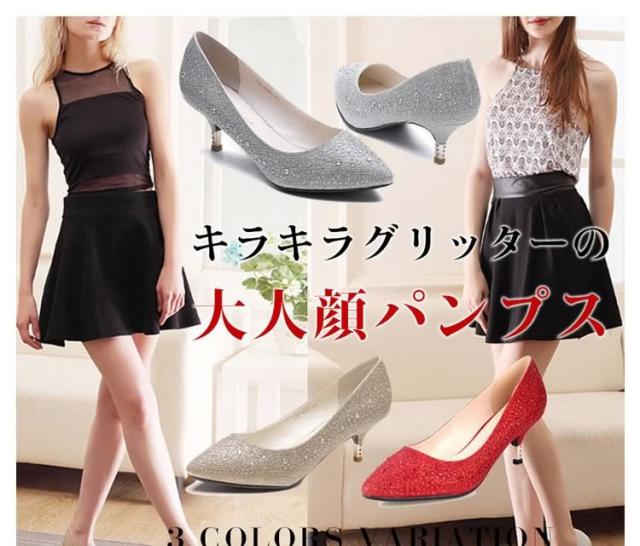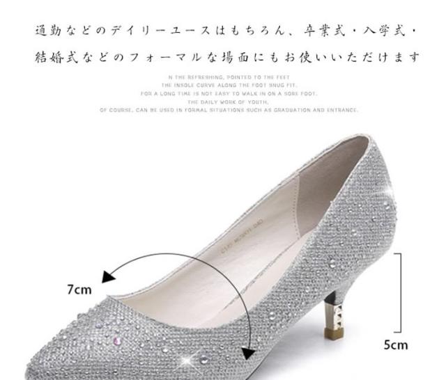 | キラキラグリッターの大人顔パンプス。ヒールの高さは5cmで美脚効果はもちろん、歩きやすさも◎さりげなく華やかなラインストーン感がポイント☆ポインテッドトゥで足元スッキリ☆足のカーブに沿ったインソールが足形にぴったりフィット。長時間履いても足が痛くない上に歩きやすいです。通勤などのデイリーユースはもちろん、卒業式・入学式・結婚式などのフォーマルな場面にもお使いいただけます。 | |