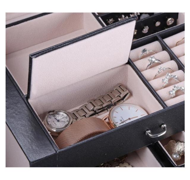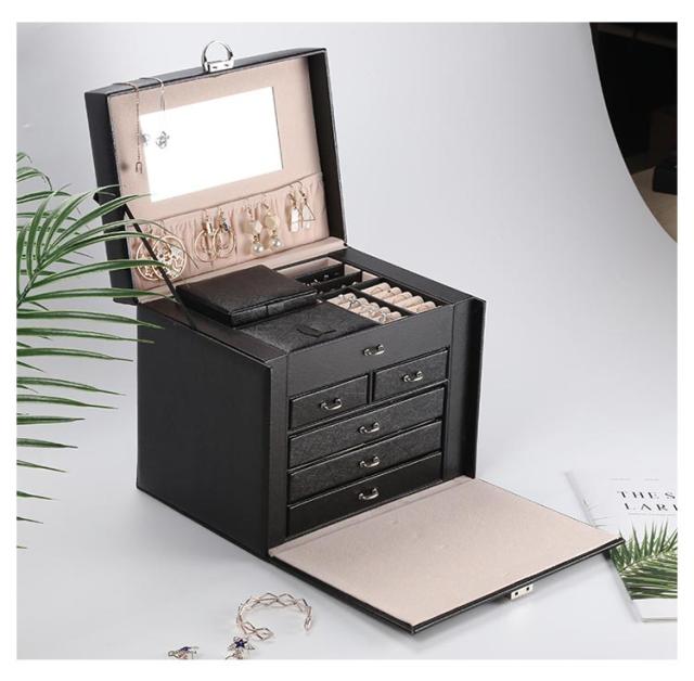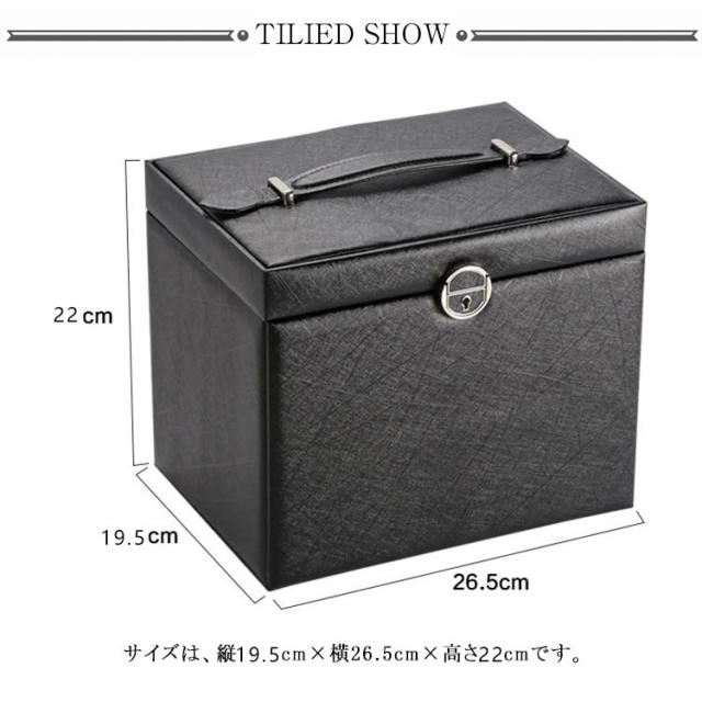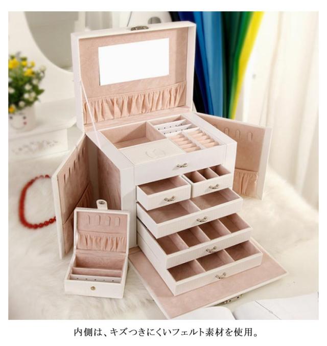 | 整理しやすい5段式の鏡付きジュエスです。 サイズは、縦19.8cm×横26.5cm×高さ23cmです。 5段(引出し4段)の収納空間があります。 小分けの仕切りがあるので種類に合わせて収納できます。 指輪やピアス、ネックレスなどの保管に。 内側は、キズつきにくいフェルト素材を使用。 両側が開けることができて、イヤリングネックレスなどが収納できます。 鏡付きなので、大切なアクセサリーを見ながら着けることができます。 オシャレなインテリアとしてもお使いください。 | |