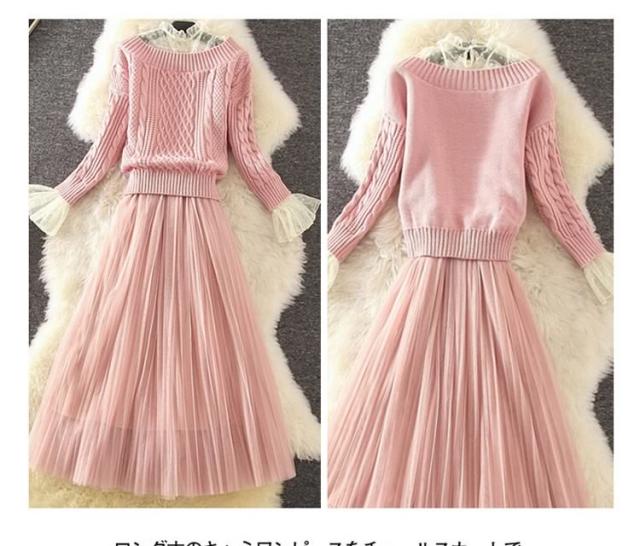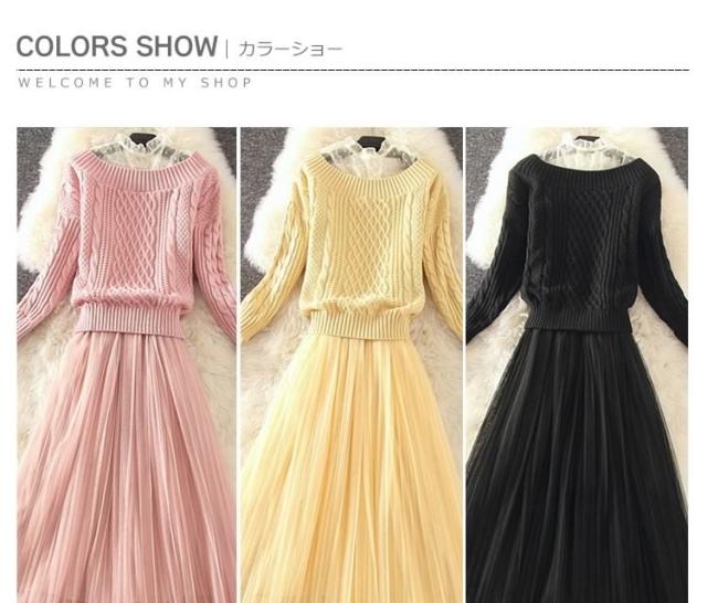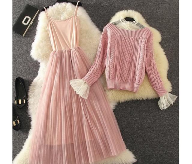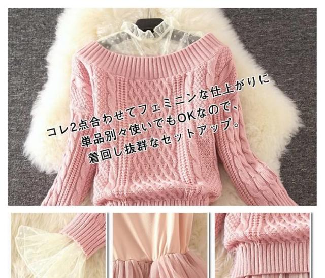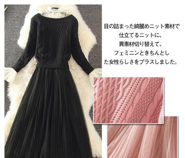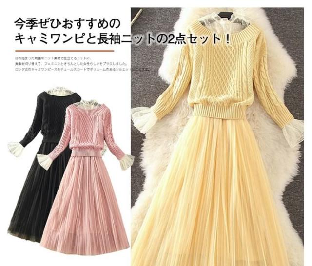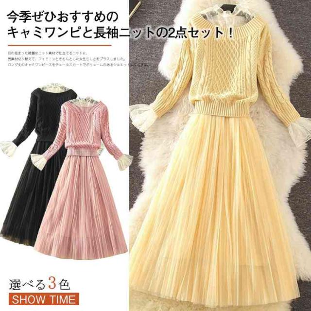 コレだけで華やかな女性らしい顔に キャミワンピと長袖ニットの2点セット キャミソールワンピース インナーワンピース ペチワンピース チュール ニットトップス ざっくりニット ニット セーター 長袖 秋冬 セットアップ レディース