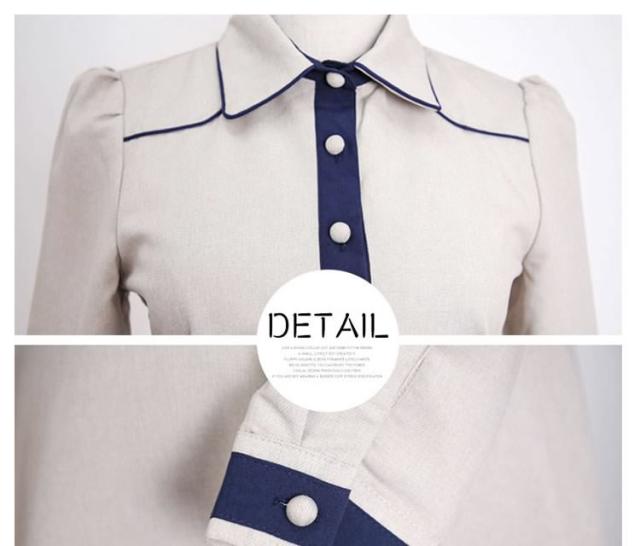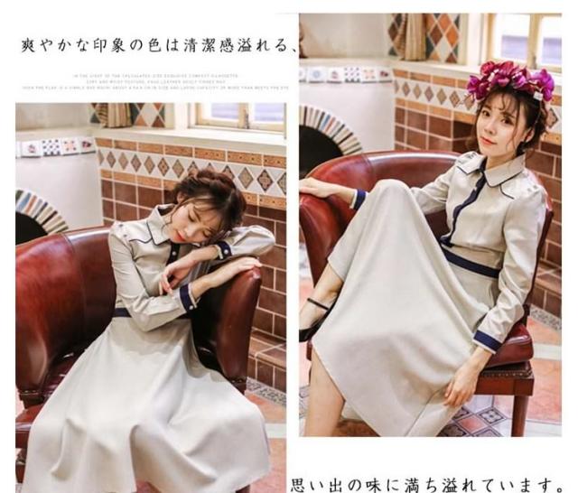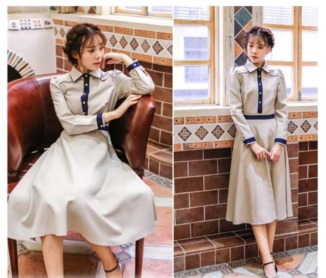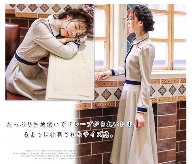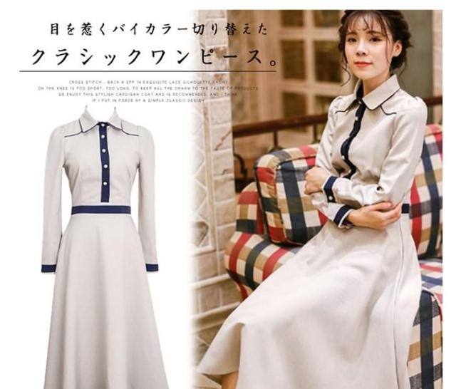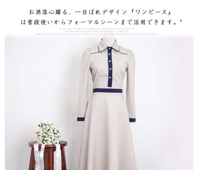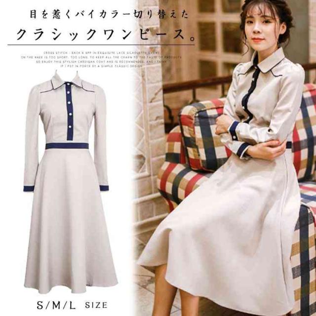 クラシックワンピース 襟付き バイカラー切り替え トレロ aラインワンピース フレアワンピース ワンピース クラシック 膝丈 ミドル丈 長袖 エレガント