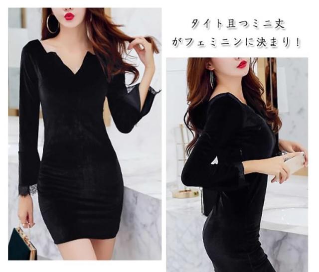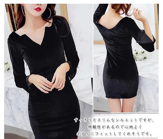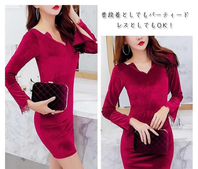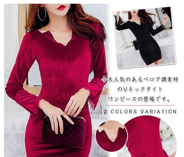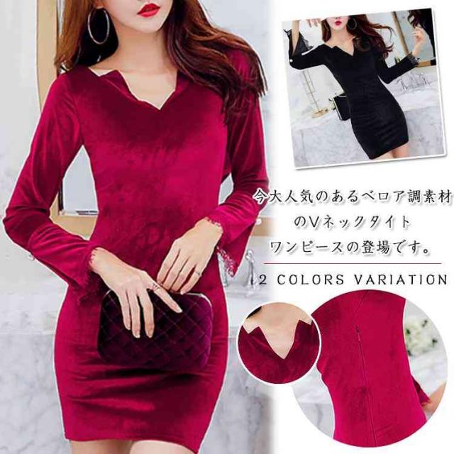 ベロアタイトワンピース Vネックワンピース ベロア素材 タイトワンピース パーティードレス ミニドレス タイト 長袖ワンピース