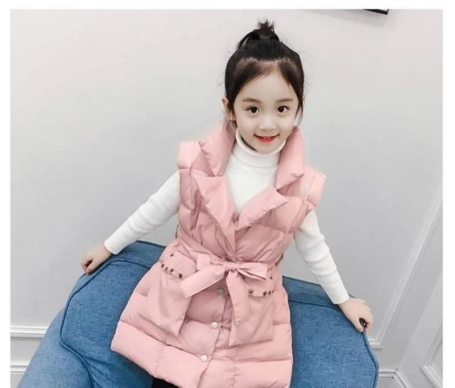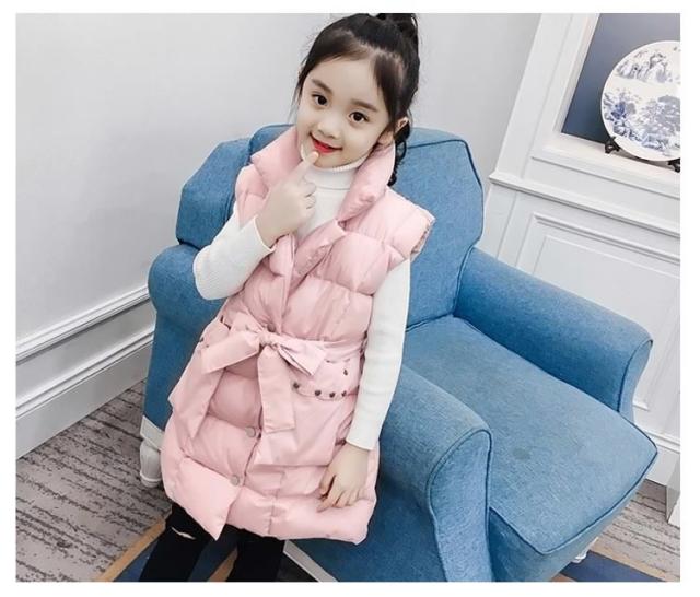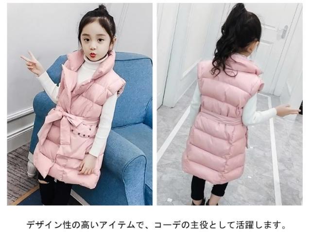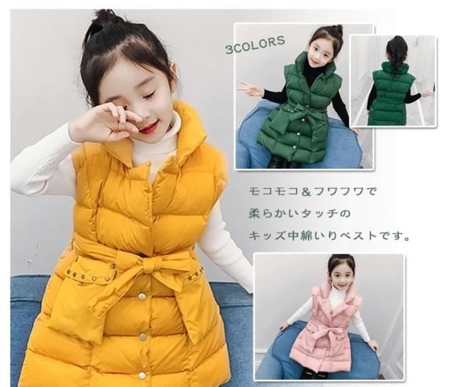 モコモコ&フワフワで柔らかいタッチのキッズ中綿いりベスト 女の子ベスト 子供服 リボン ベルト 可愛い アウター リベット スナ