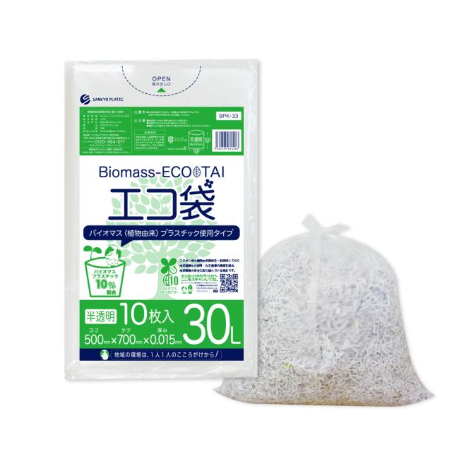 【バラ販売】BPK-33bara バイオマスプラスチック使用エコ袋 30リットル 0.015mm厚 10枚 半透明 / ゴミ袋 ごみ袋