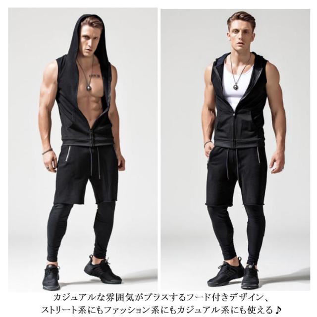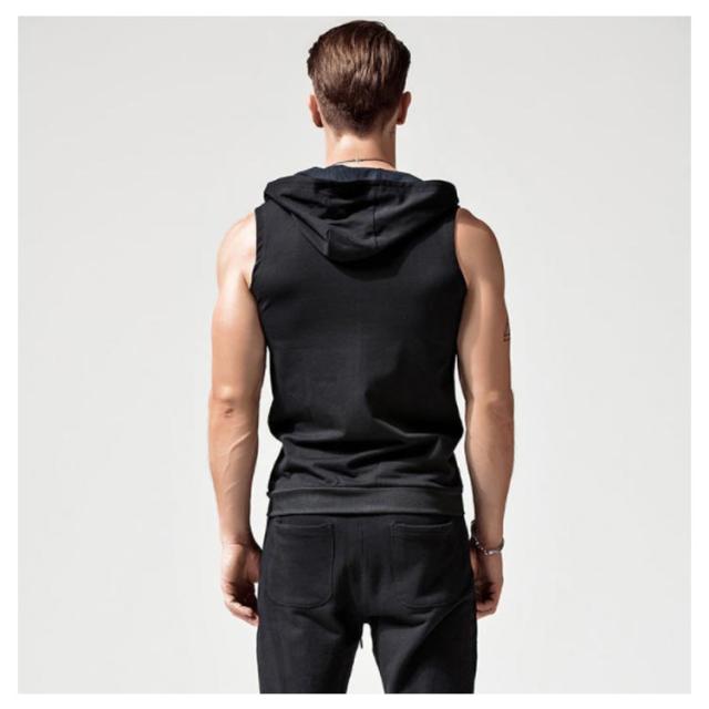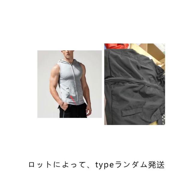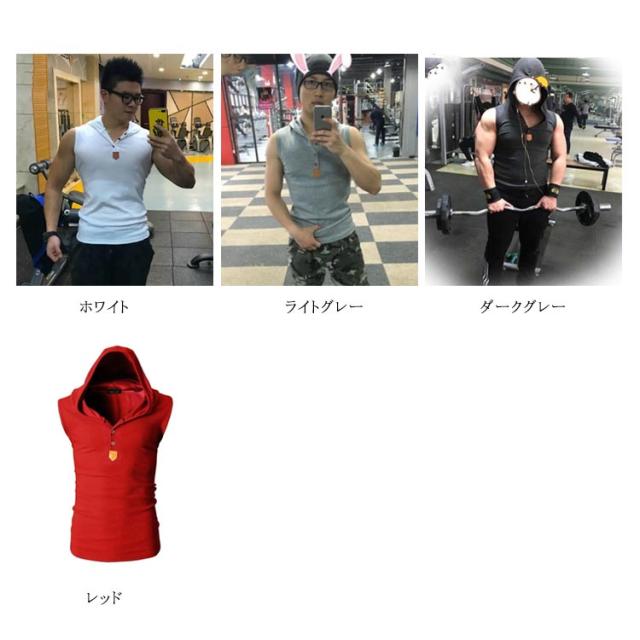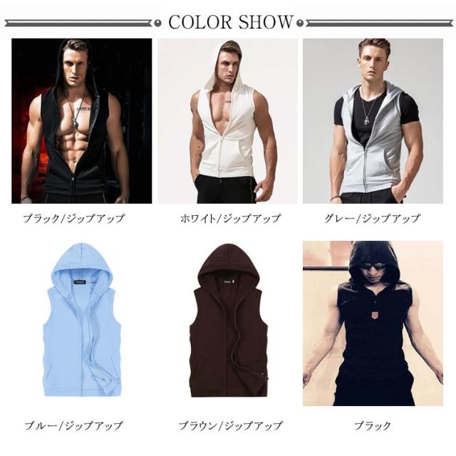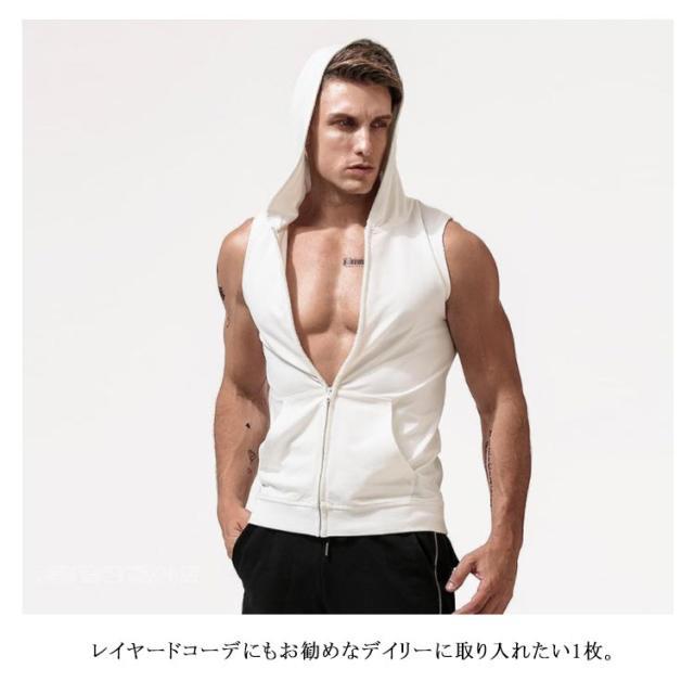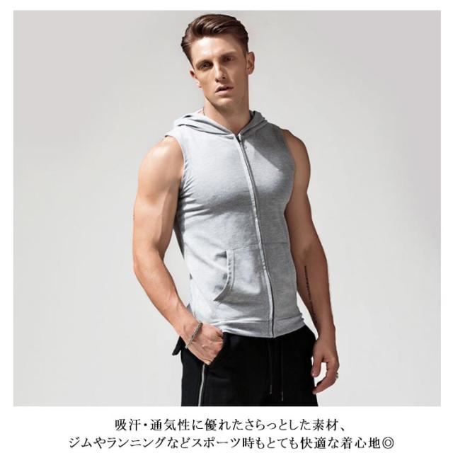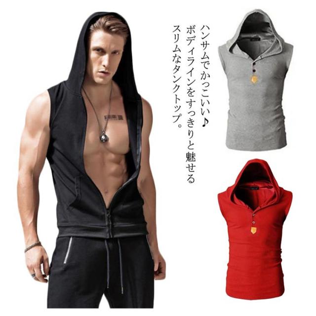 メンズTシャツ ノースリーブ タンクトップ フード付き 送料無料 袖なし ジップアップパーカー プルオーバー スリム トップス 無地 夏服 春夏 B系