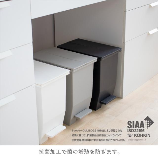 抗菌加工+手を使わず開閉できるペダル式でキッチンでの使用も衛生的に使用できて左右両開きのフタは棚下に置いたままごみが捨てられます。