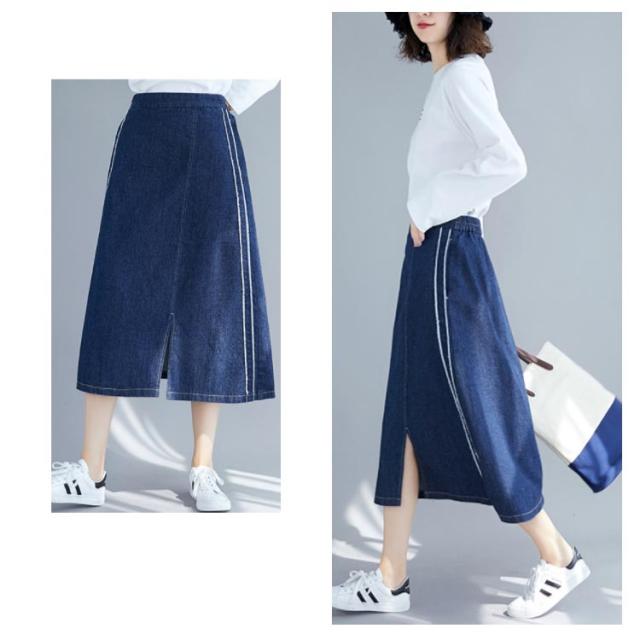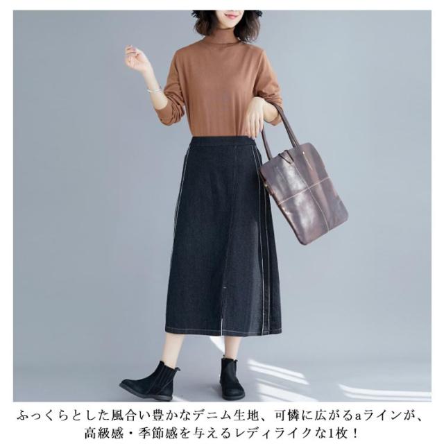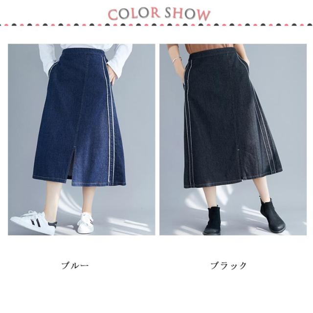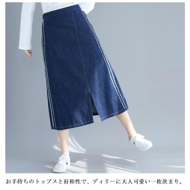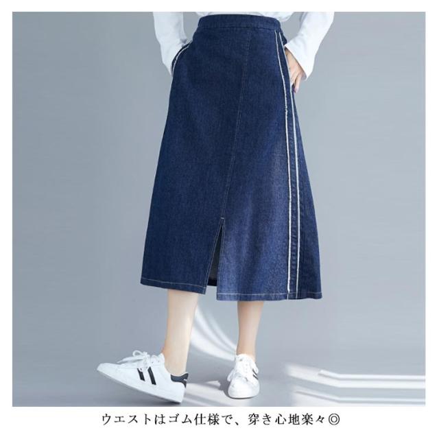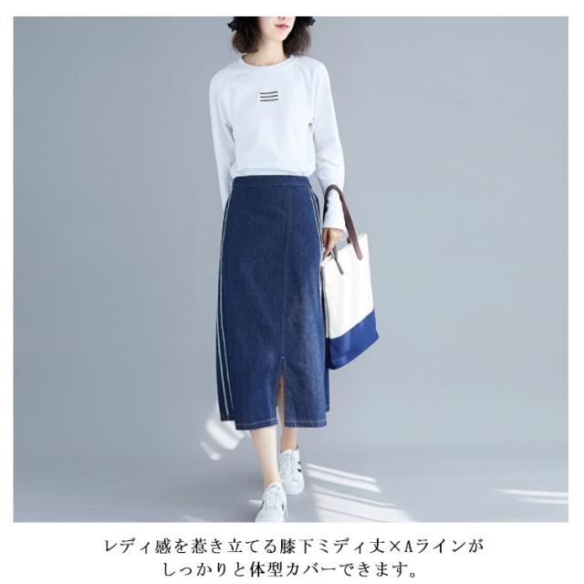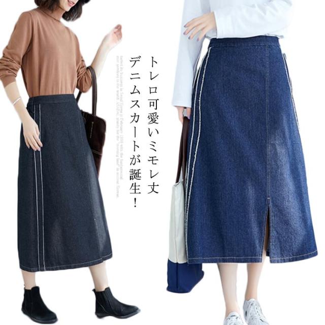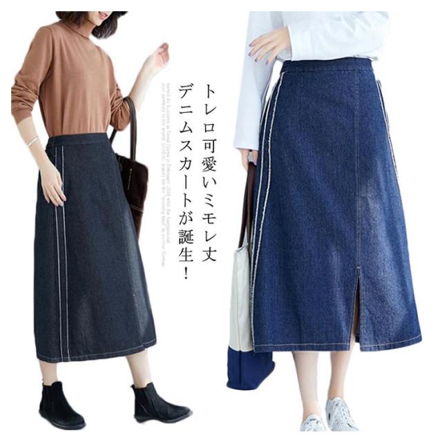 デニムスカート スカート ミモレスカート スリット入り カジュアルスカート デニムロングスカート Aライン 膝下丈 ハイウエスト トレロ 可愛い 春 夏 秋