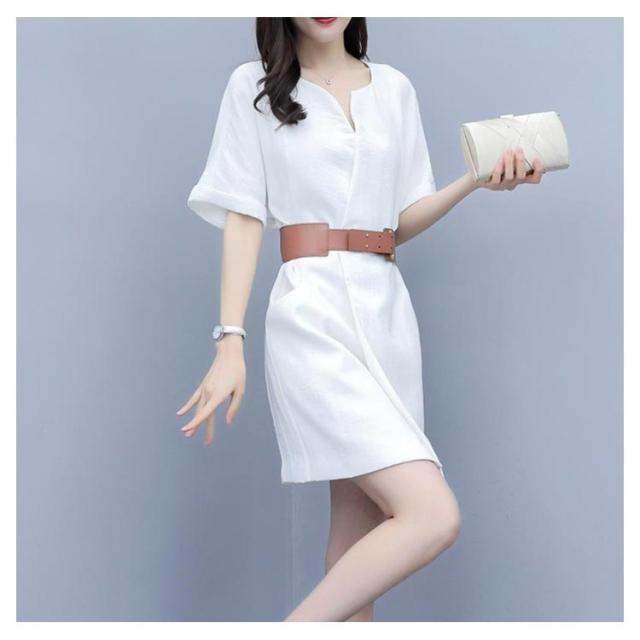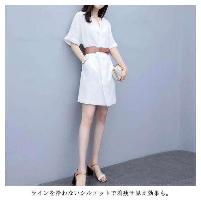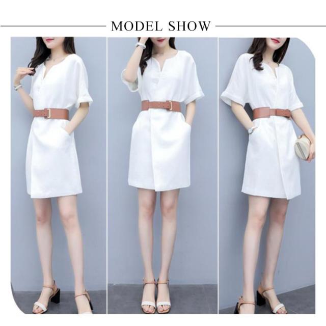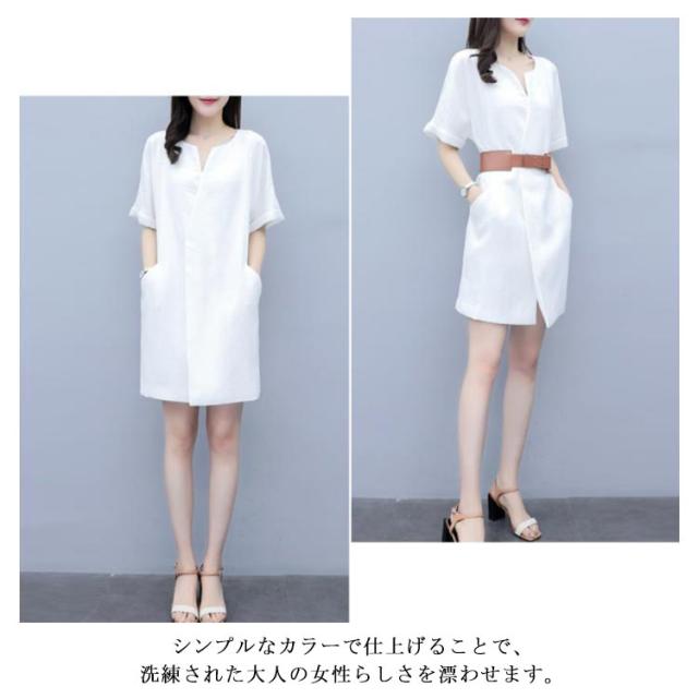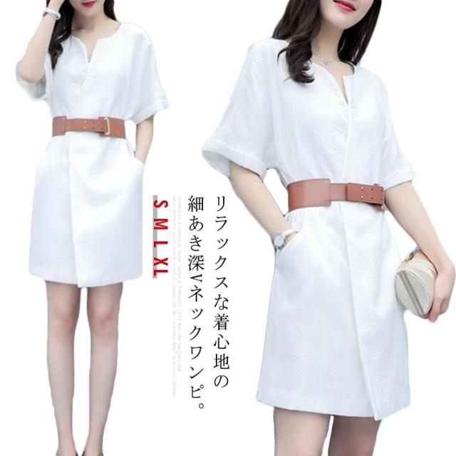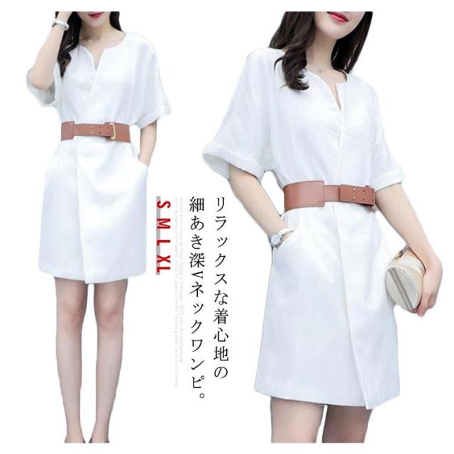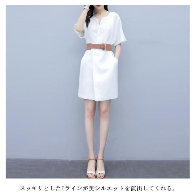 ワンピース レディース ショート丈 Vネック 半袖 無地 着痩せ 韓国風 オシャレ ベルト付き 体型カバー 大人女子 上品 通勤 シンプル オフィス