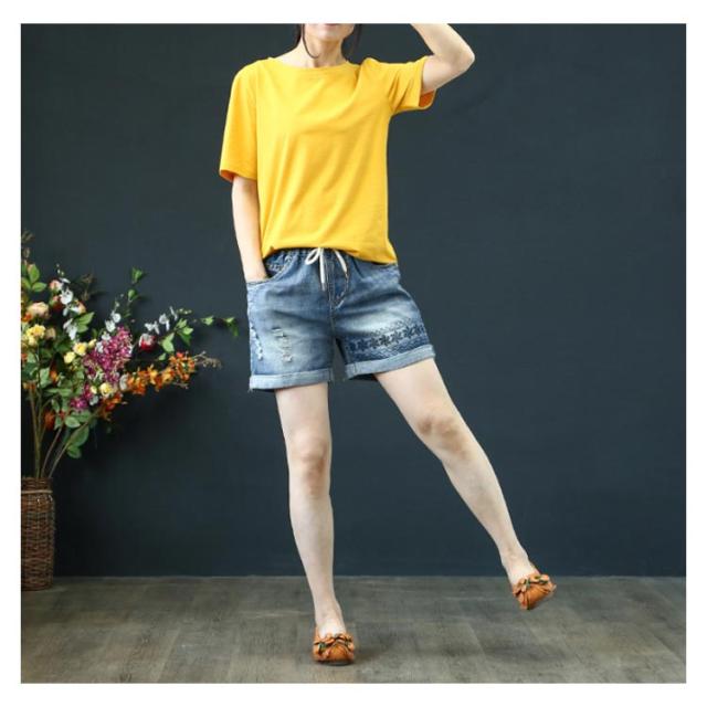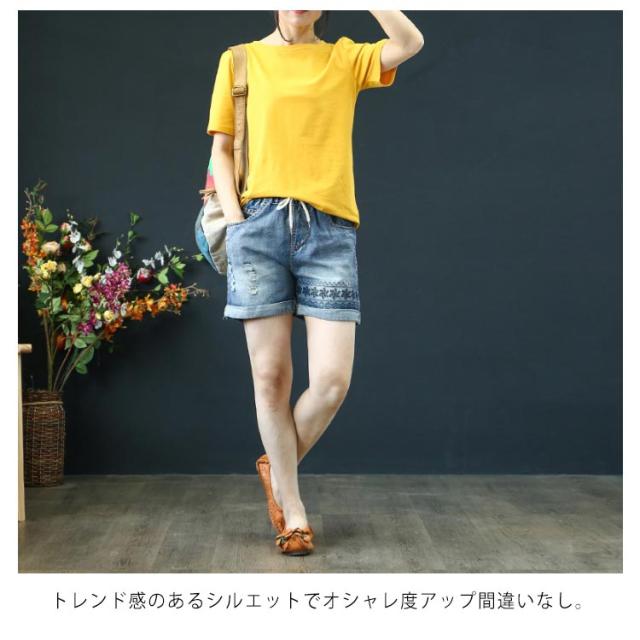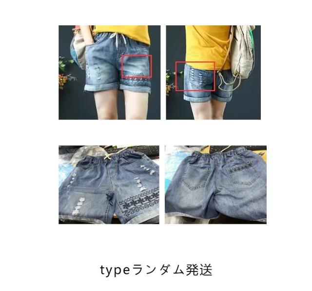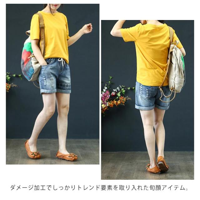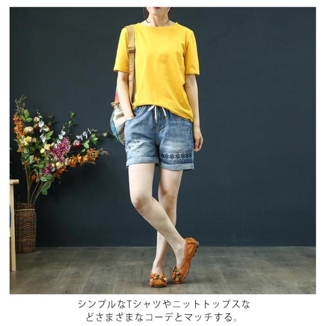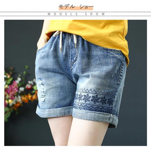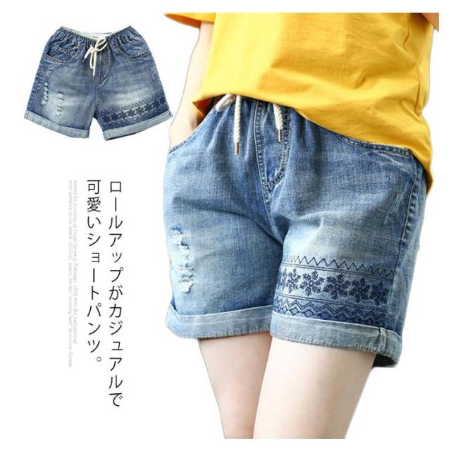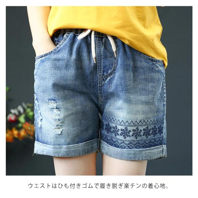 ショートパンツ レディース デニムパンツ ショーパン ジーンズ 刺繍 ウエストゴム ダメージ加工 ゆったり お洒落 大きいサイズ カジュアル