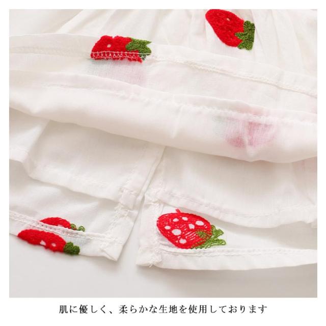 | キッズイチゴ柄刺繍ノースリーブワンピース 肌に優しく、柔らかな生地を使用しております 通気性に優れた素材なので、ムレにくく快適 ゆとりのあるシルエット、着心地ラクラク爽やかな色使いは清潔感を与えてます | |