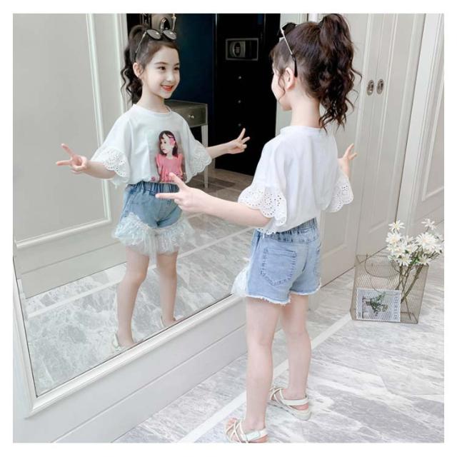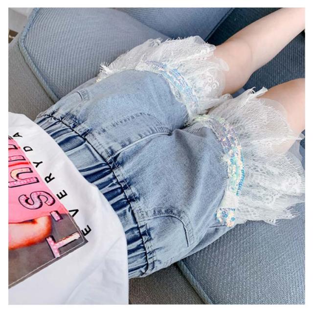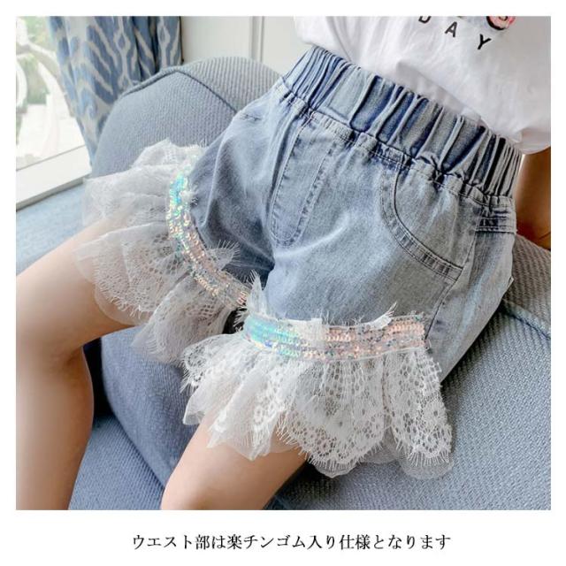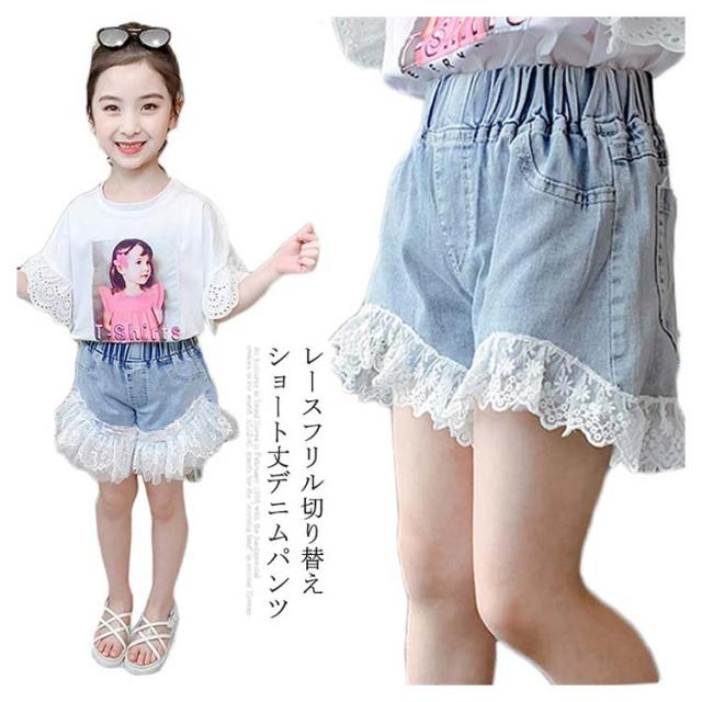 デニム 子供服 ショートパンツ ショートデニム デニムパンツ レースフリル レース付き ウエストゴム ウォッシュ加工 色落ち 薄手 ストレッチデニム お洒落 カジュアル ボトムス 夏物