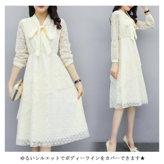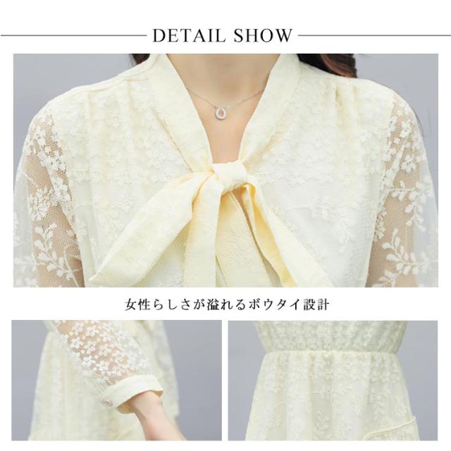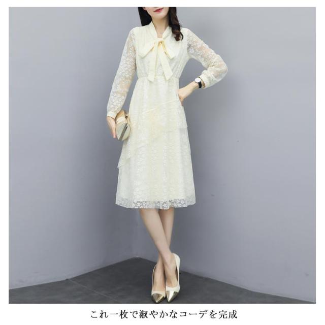 ミモレワンピース レディース 長袖ワンピース 総レースワンピース 花柄レース 長袖 ボウタイ リボン 透け感 裏地付き ロングワンピース ミモレ丈 キレイめ フェミニン 大人可愛い 春秋 春新作