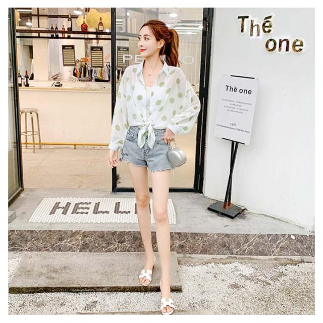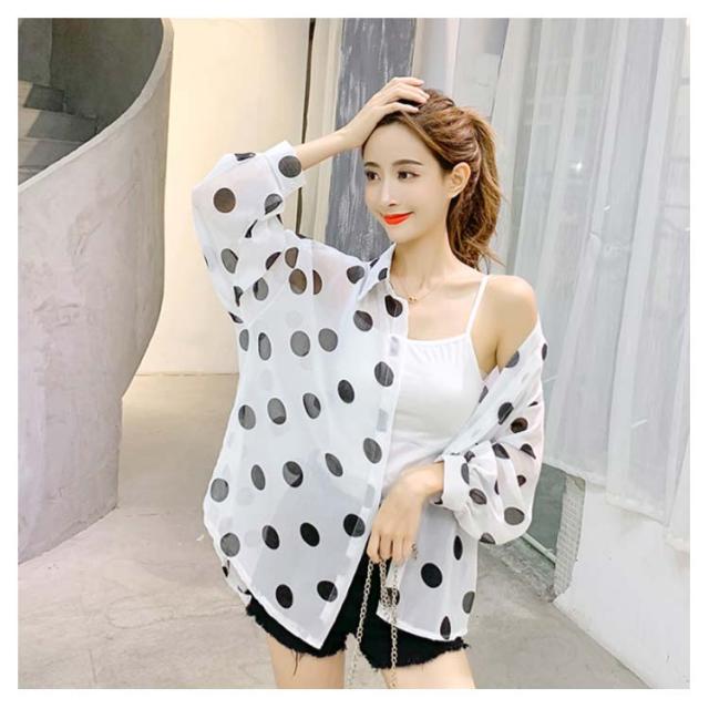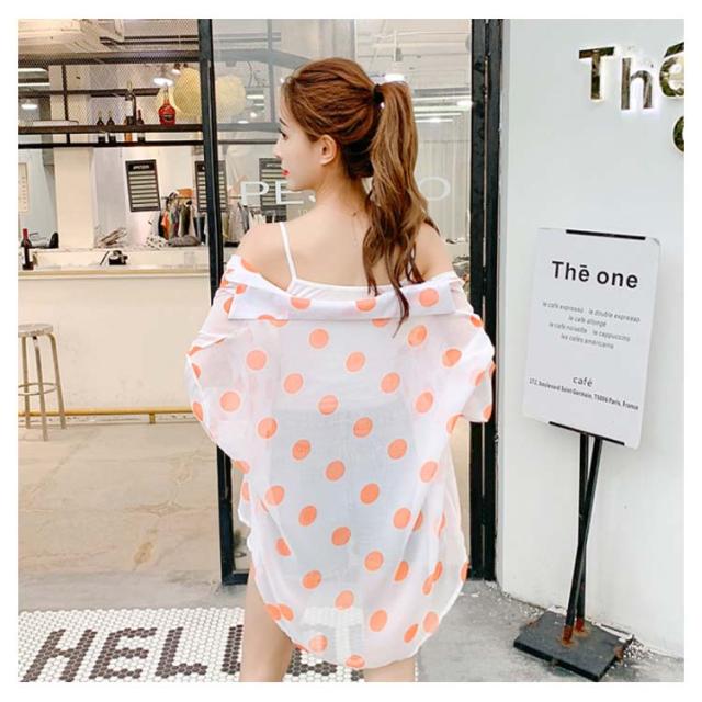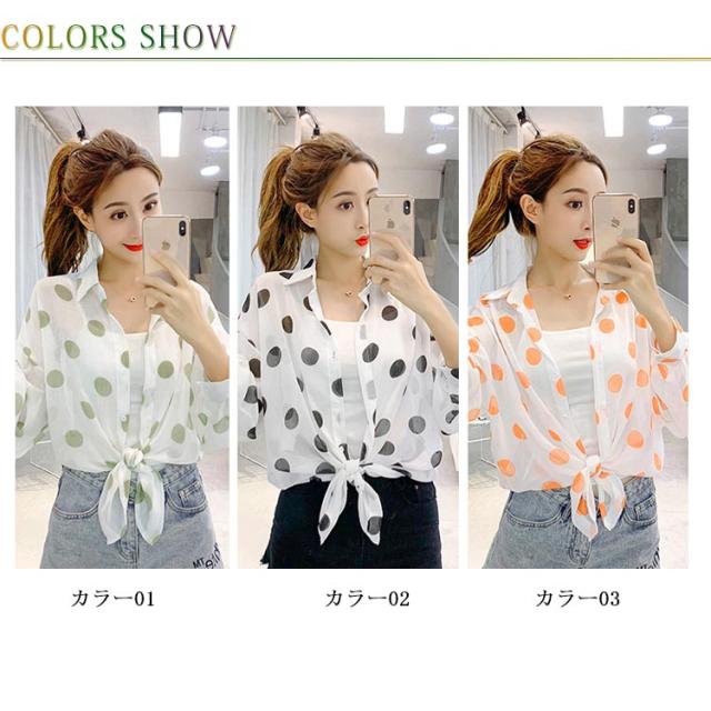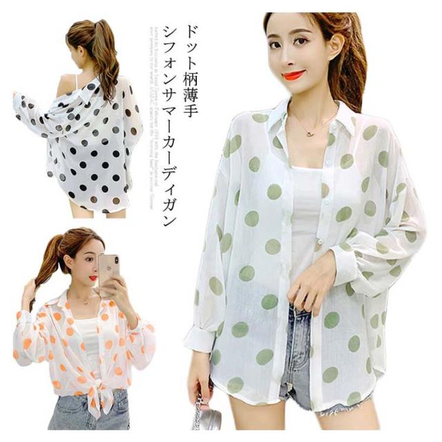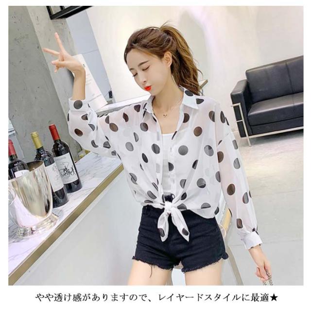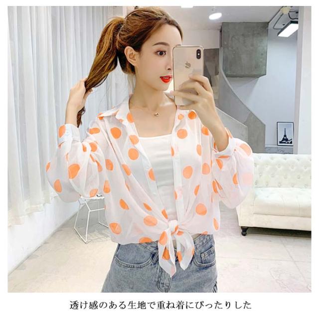 ドット柄 レディース シャツ シフォンシャツ ゆるシャツ 薄手シャツ 水玉柄シャツ ロングシャツ 長袖 透け感 サマーカーディガン 不規則裾 透け感 冷房対策 お洒落 カジュアル リゾート ゆったり 夏新作