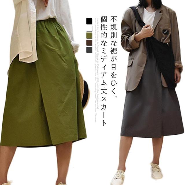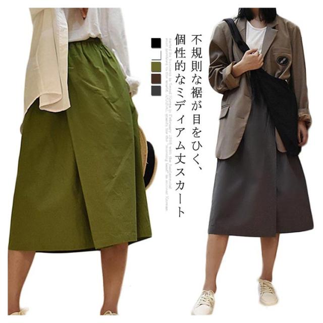 スカート レディース ミディアムスカート 膝下丈スカート 無地スカート カジュアルスカート フレアスカート 不規則 ウエストゴム Aライン ハイウエスト 個性的 スペシャル お洒落 普段着 春新作