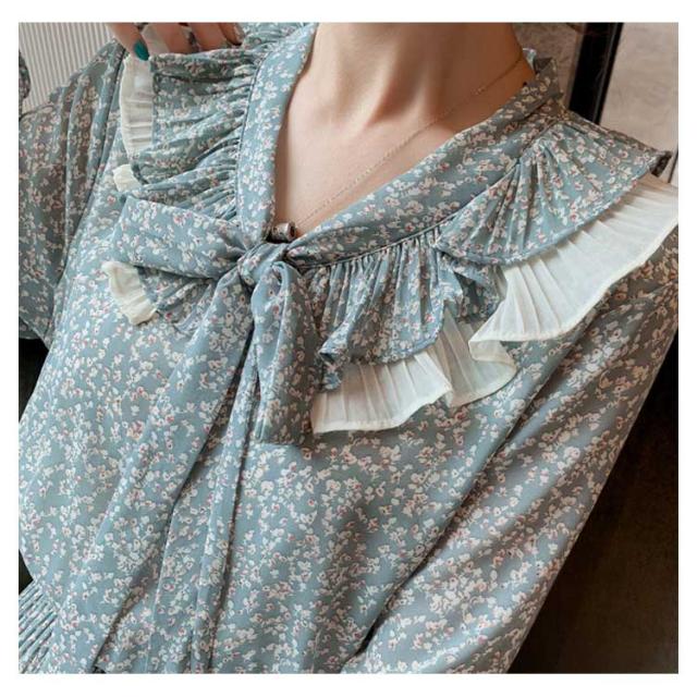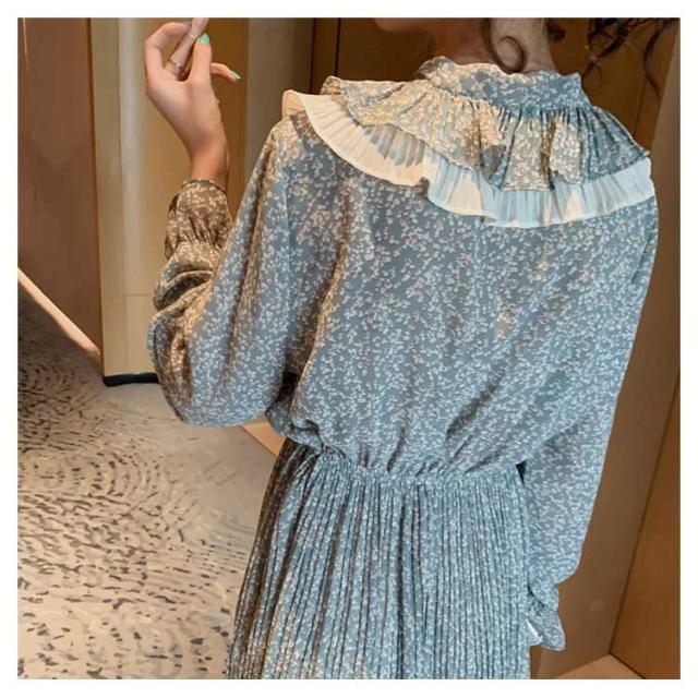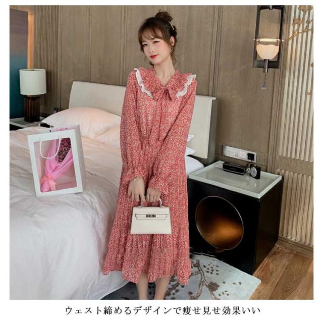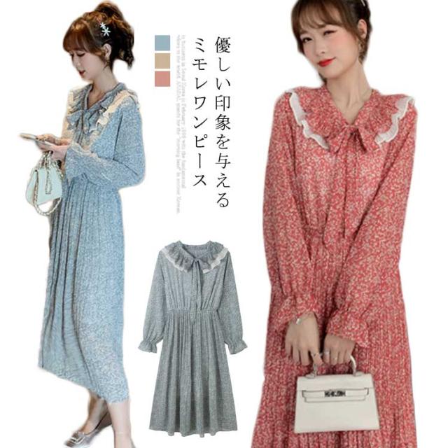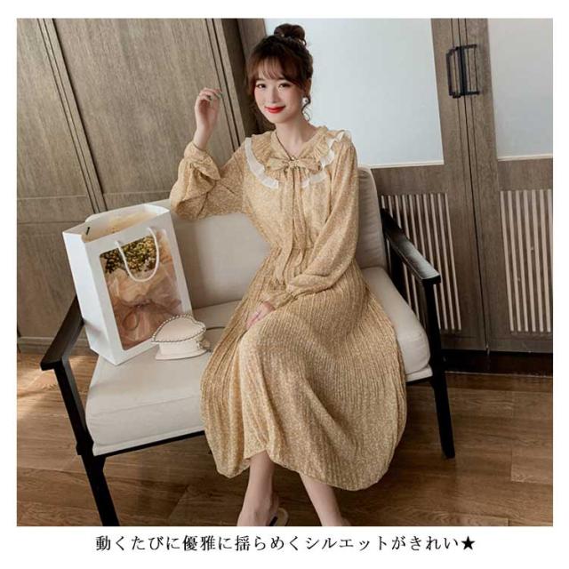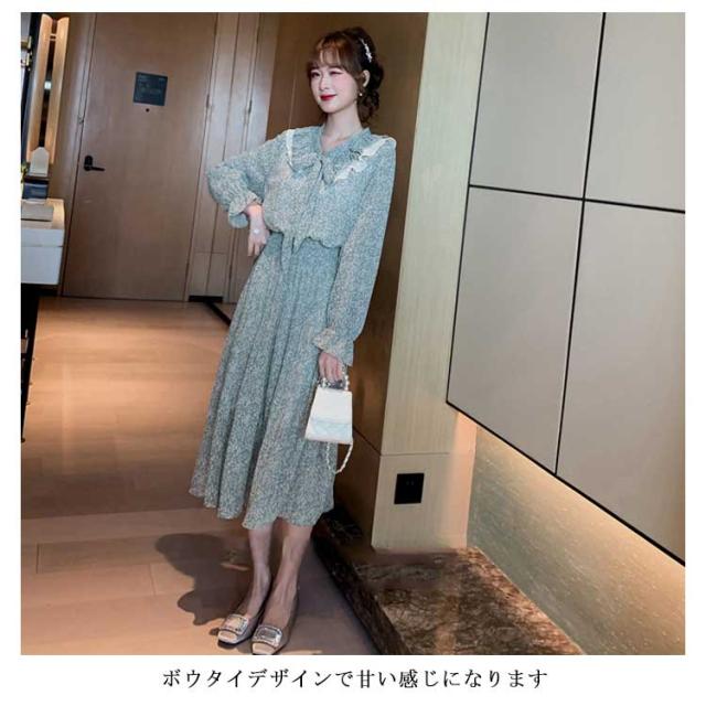 ワンピース レディース ミモレ丈ワンピース ロング丈ワンピース 長袖ワンピース 小花柄 波打ち フリル ボウタイ 可愛い エレガント キレイめ お洒落 春新作
