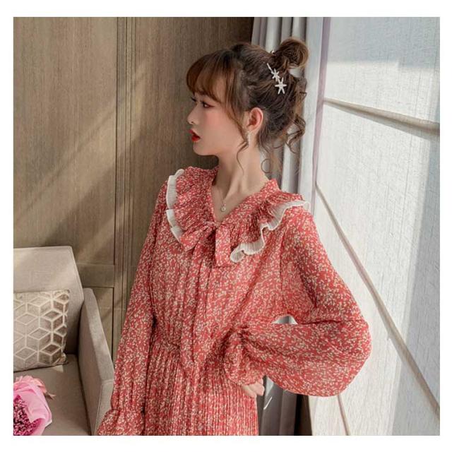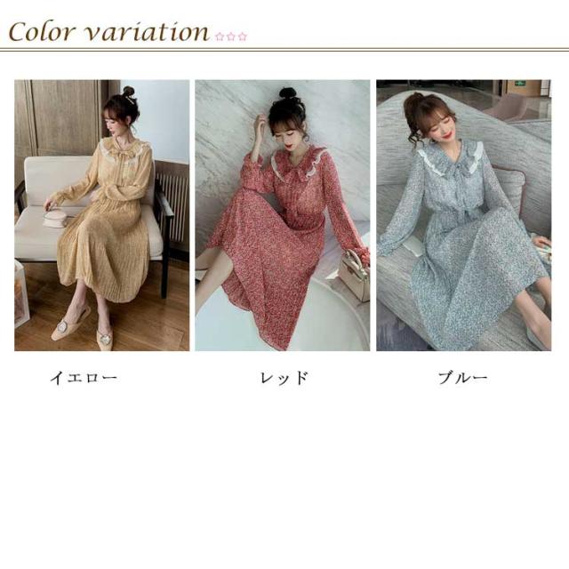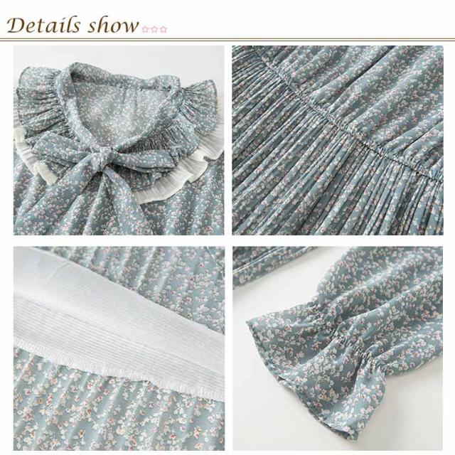 | 優しい印象を与えるミモレワンピース フリル飾る折り襟でキュートな感じになります 綺麗な小花柄デザインでこれから季節にぴったり ボウタイデザインで甘い感じになります ウェスト締めるデザインで痩せ見せ効果いい | |