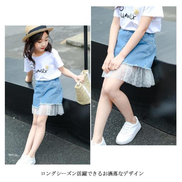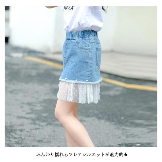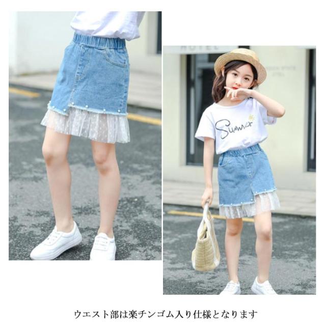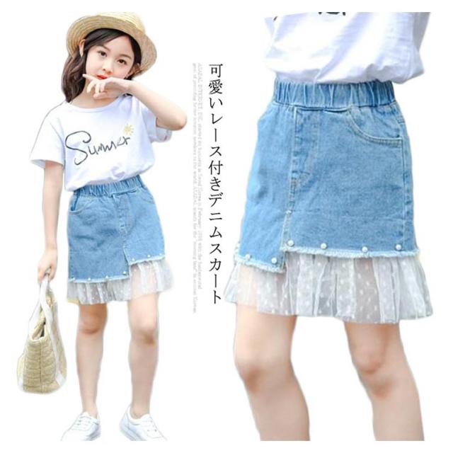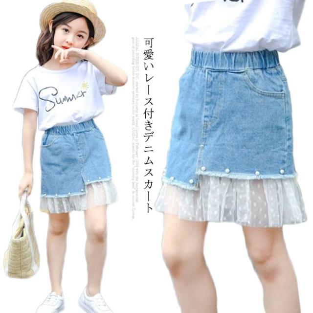 デニムスカート 子供服 スカート フレアスカート ミディアムスカート デニム ウエストゴム レース付き 色落ち ウォッシュ加工 お洒落 カジュアル 女の子 女児 ガールズ ボトムス 夏新作