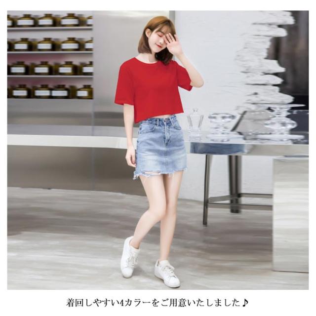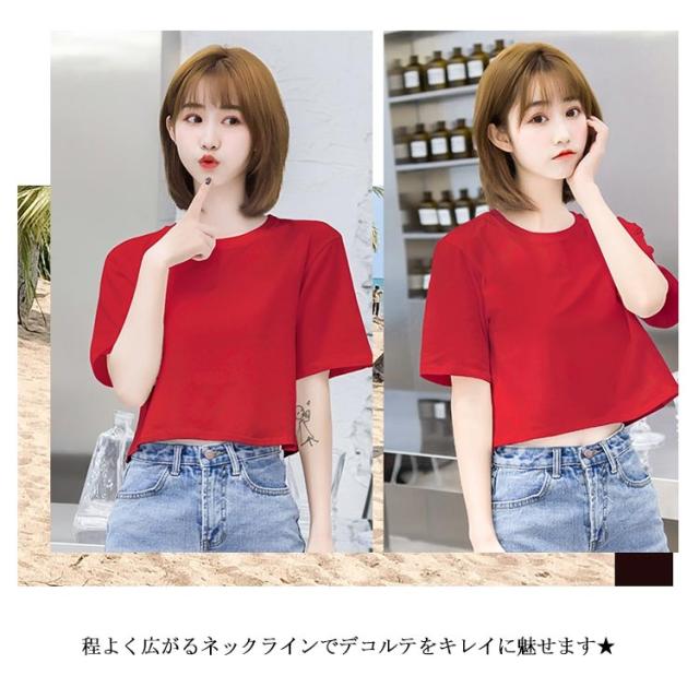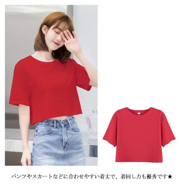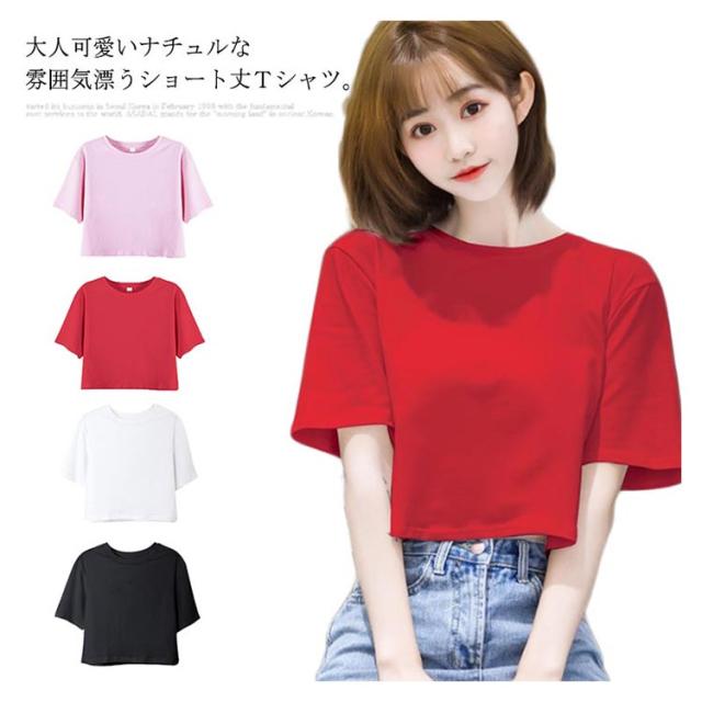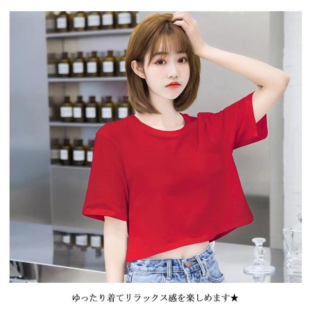 Tシャツ レディース 半袖Tシャツ へそだし ラウンドネック ストレッチ ゆったり ショート丈 ショートTシャツ トップス プルオーバー お洒落 大きいサイズ カジュアル シンプル リラックス 夏物 夏新作