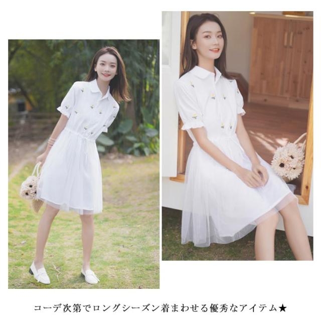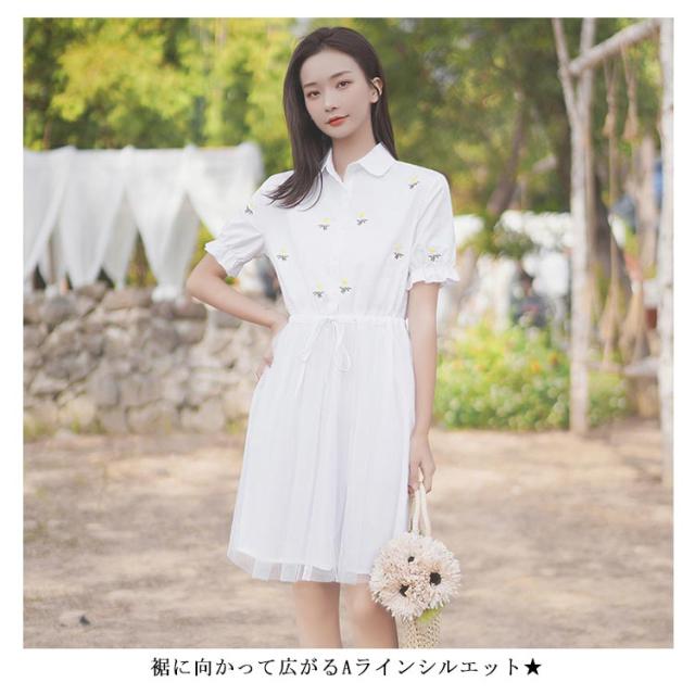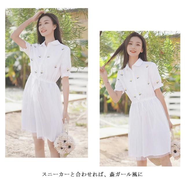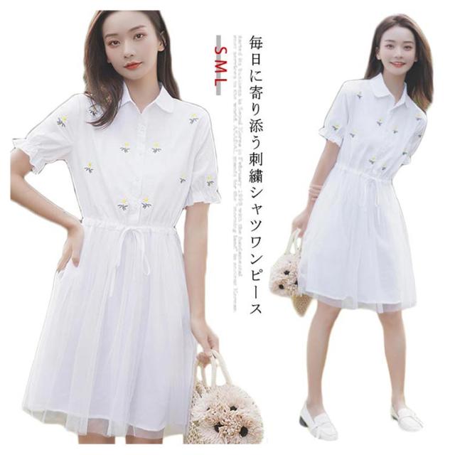 シャツワンピース レディース ワンピース ミディアムワンピース 刺繍 膝上丈ワンピース 半袖 フレアワンピース ポロ リボン付き 折り襟 チュールスカート 森ガール Aライン 着痩せ お洒落 キレイめ カジュアル 薄手 春物 夏物 夏新作