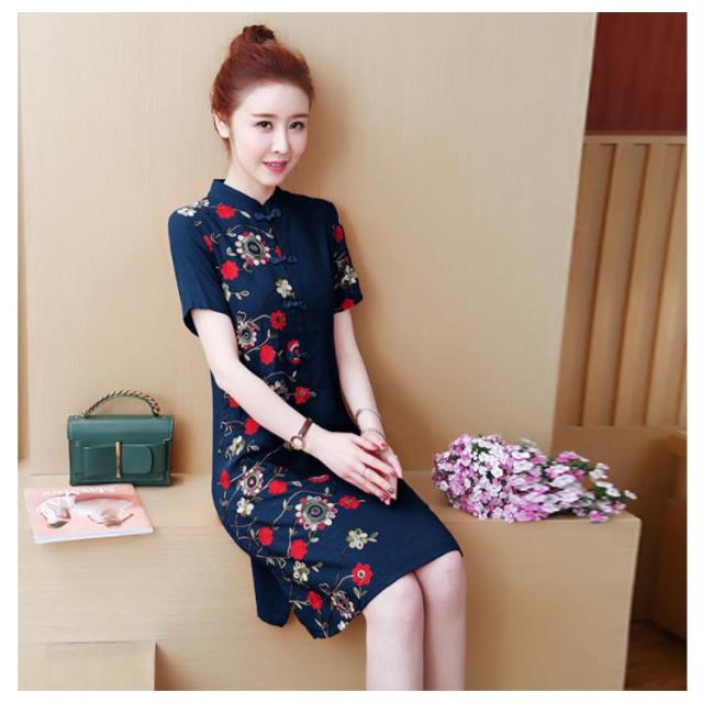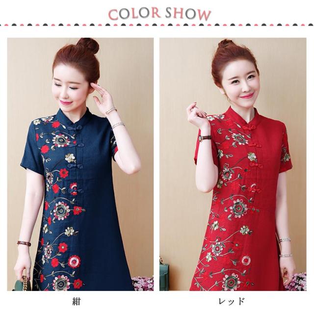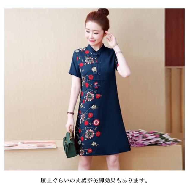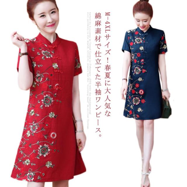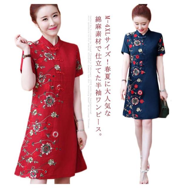 M-4XLサイズ!綿麻刺繍ワンピース チャイナドレス 刺繍ワンピース 半袖 綿麻ワンピース ワンピース 膝上丈 花柄 刺繍 aライン 大きサイズ 春夏 おしゃれ 可愛い
