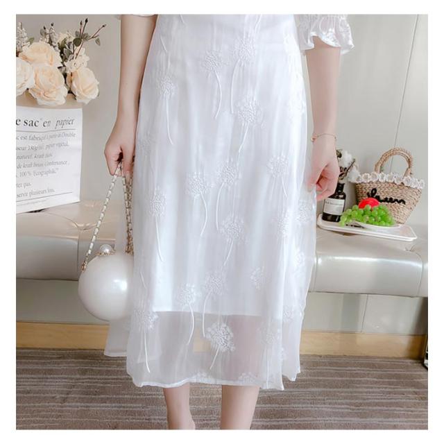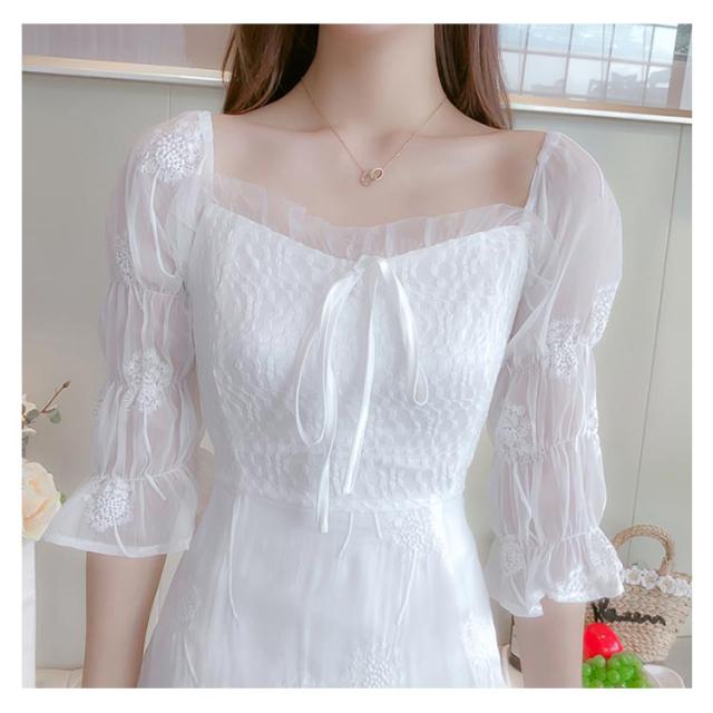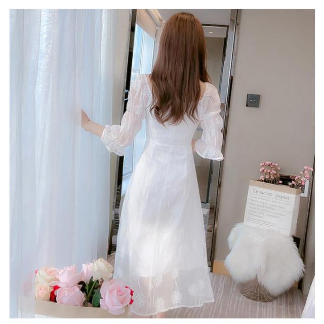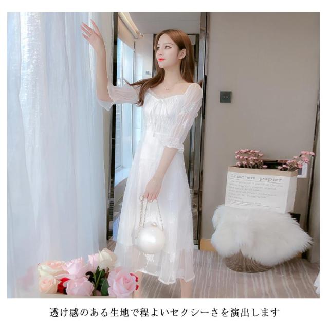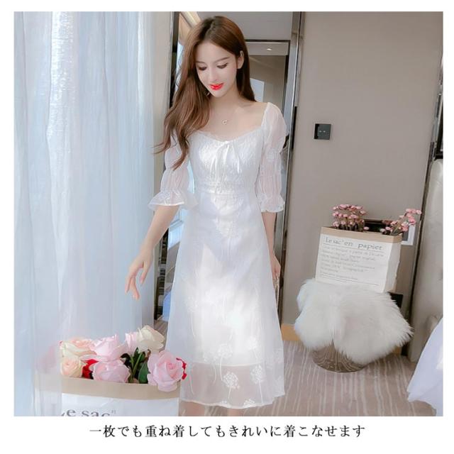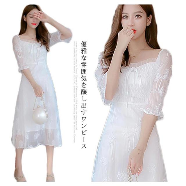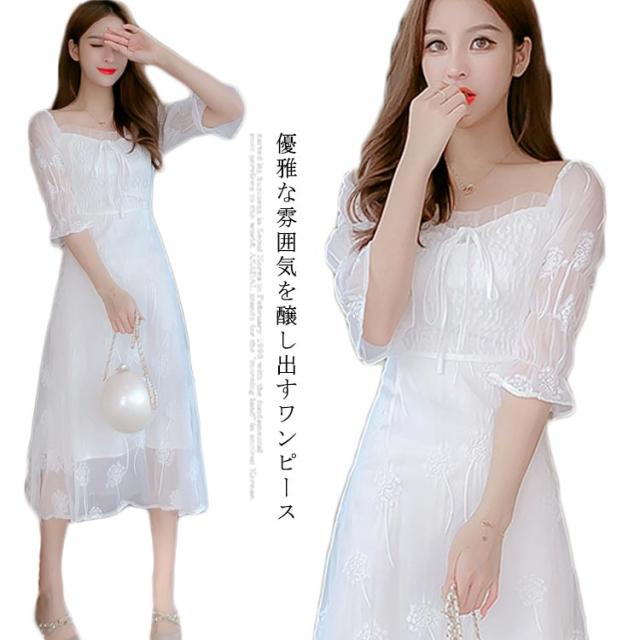 ワンピース レディース ミモレワンピース ロングワンピース 刺繍ワンピース レース チュール 五分袖ワンピース ロング丈 シャーリング 無地 エレガント 透け感 裏地付き フェミニン キレイめ お洒落 春夏 夏新作