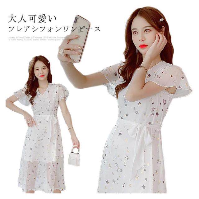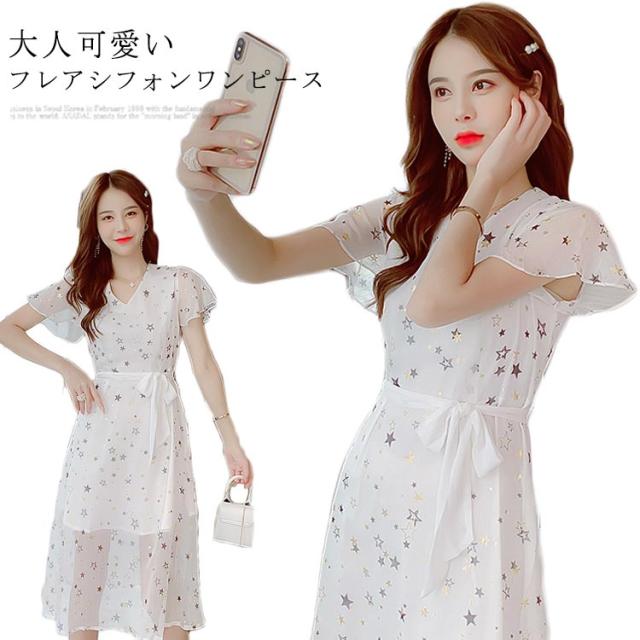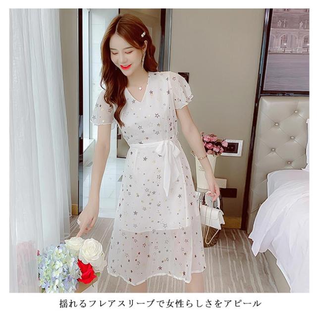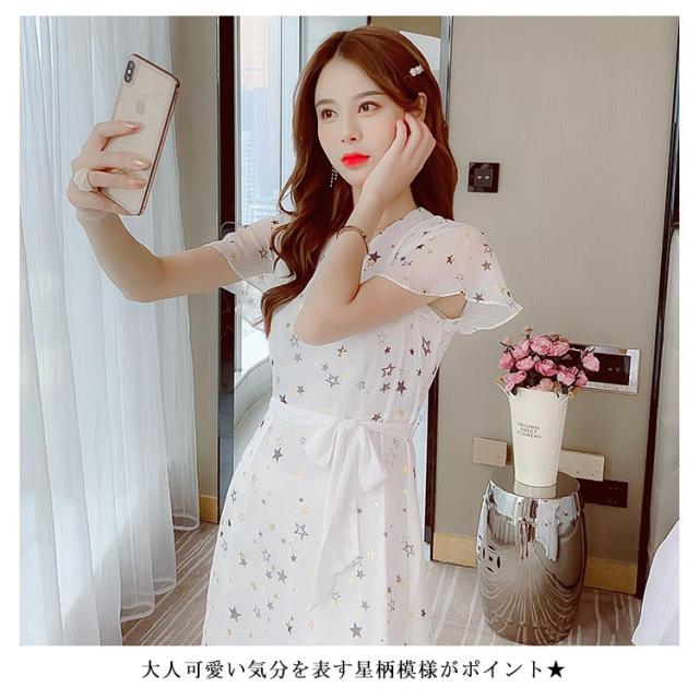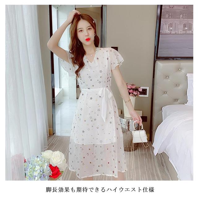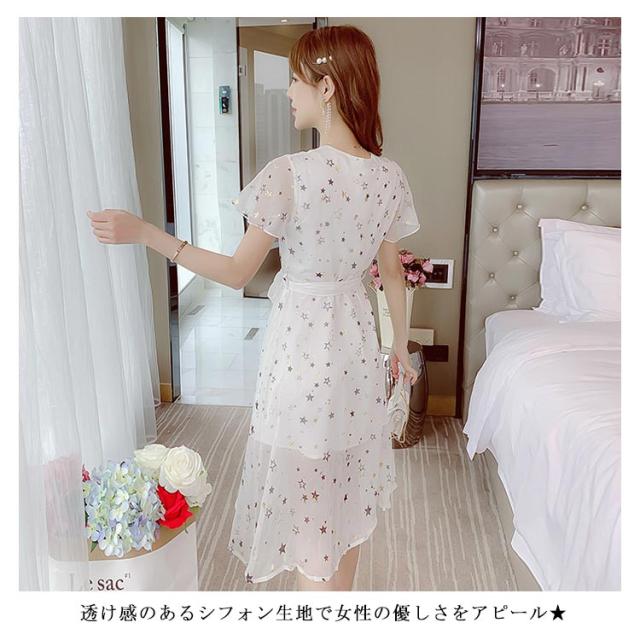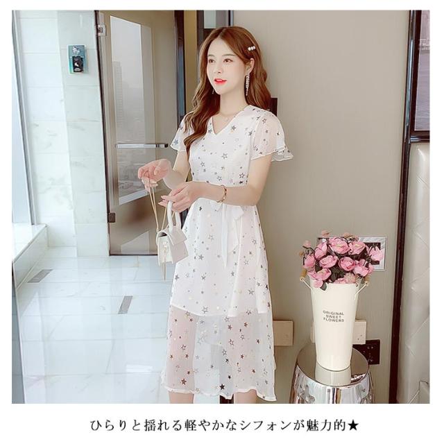 ワンピース レディース シフォンワンピース ミモレワンピース ロングワンピース 半袖 フレアスリーブ Vネック ウエスト紐 薄手 星柄 透け感 キレイめ お洒落 エレガント 普段着 旅行 夏物 夏新作