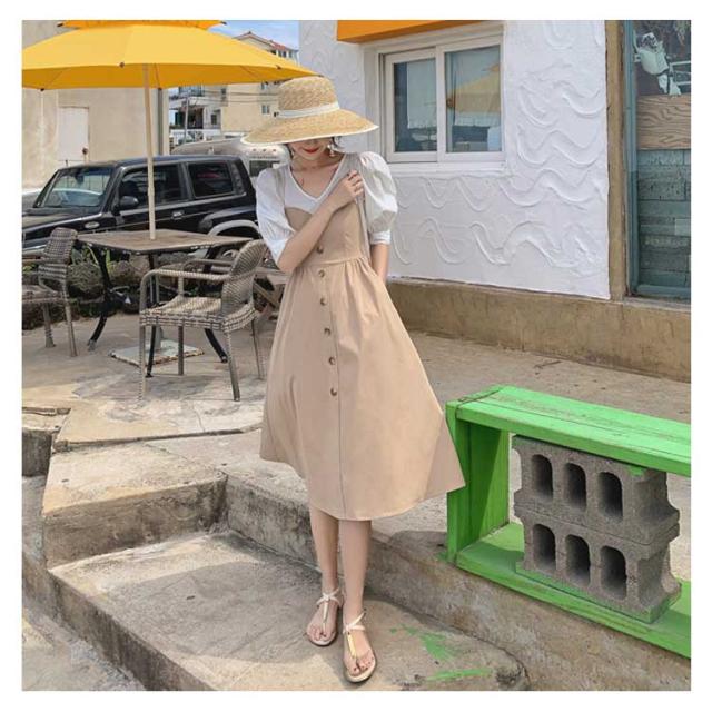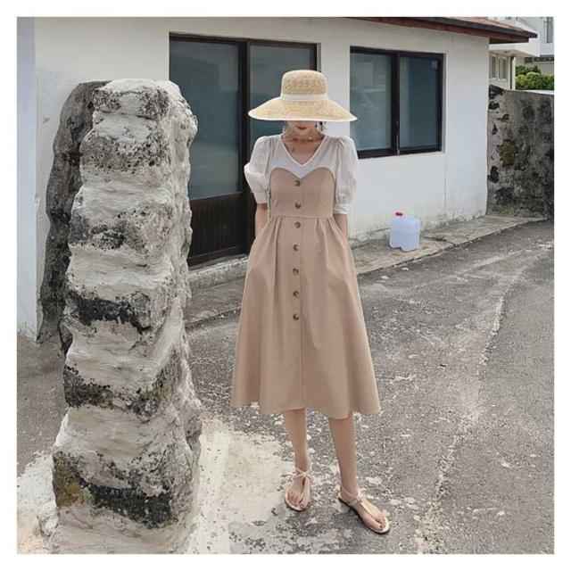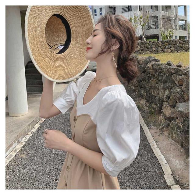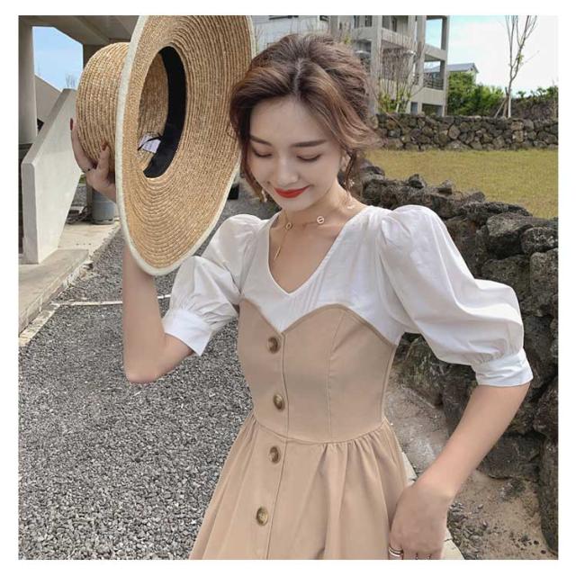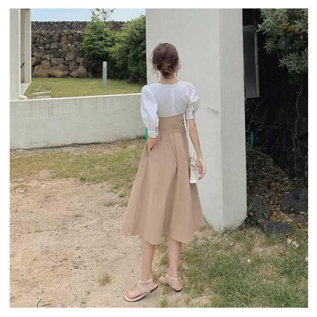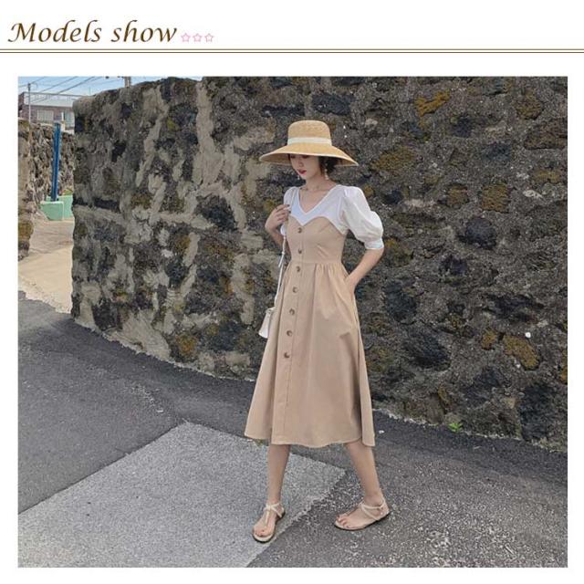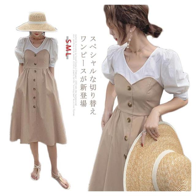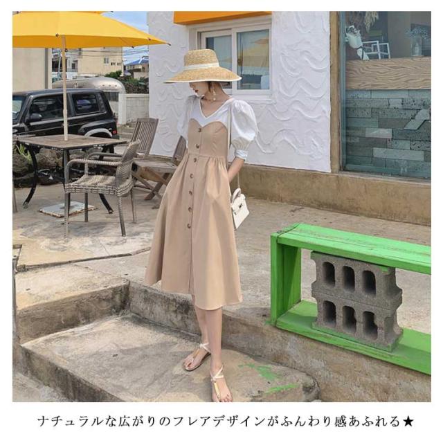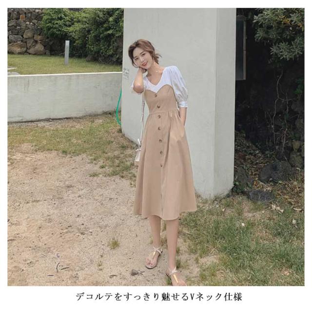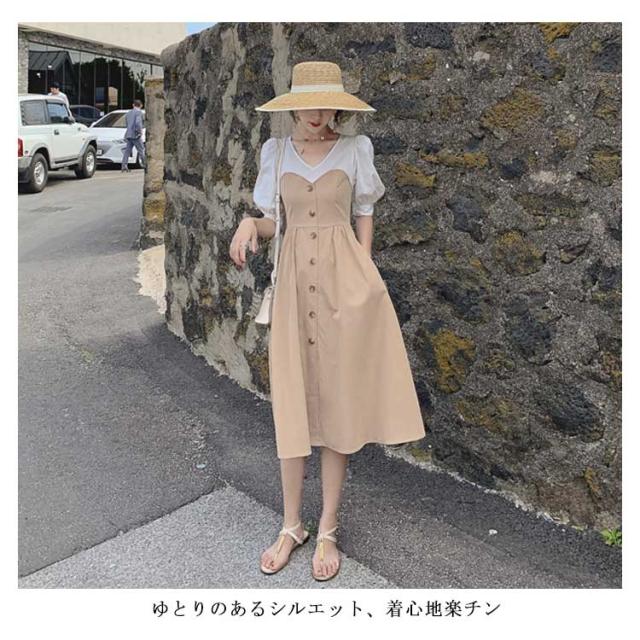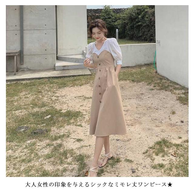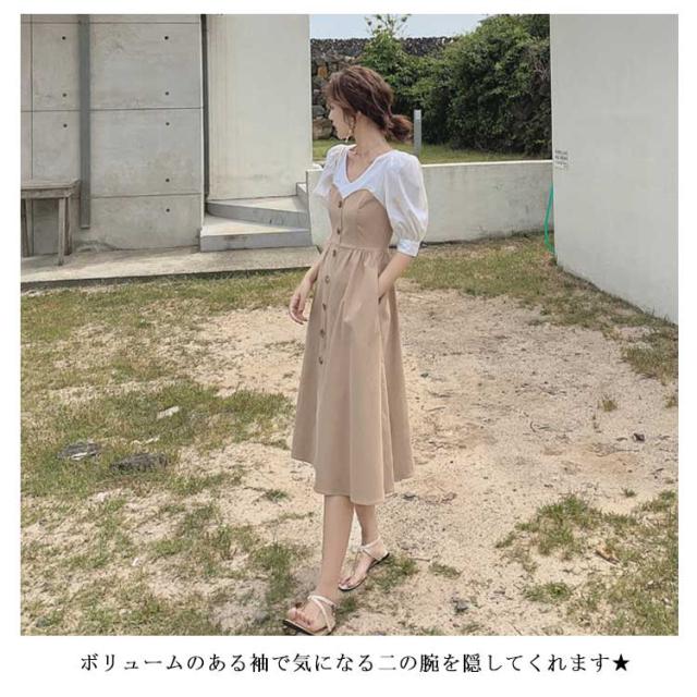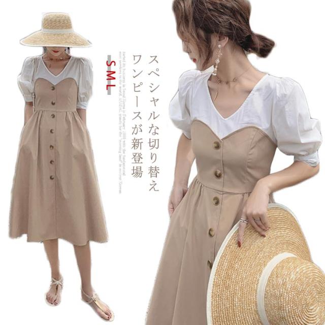 ワンピース レディース 切り替えワンピース ロングワンピース ミモレワンピース 五分袖 ボリュームスリーブ 無地 Vネック フレアワンピース ハイウエスト ゆったり ふんわり お洒落 キレイめ こなれ感 夏新作