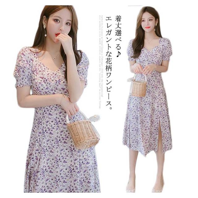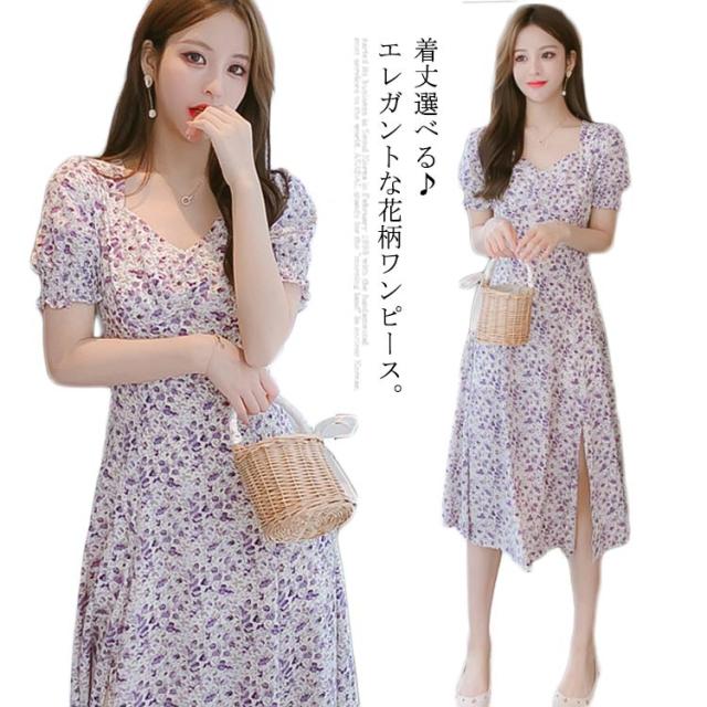 着丈選べるワンピース レディース シフォンワンピース シフォン ミモレワンピース 膝丈ワンピース ロング丈ワンピース ミティアム丈 半袖 花柄 ハイウエスト 裏地付き リゾート ふんわり キレイめ 大人可愛い