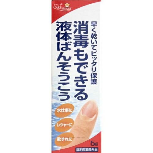 ケアハート 消毒もできる液体ばんそうこう 5g *医薬部外品 玉川衛材/消毒もできる液体ばんそうこう/すり傷/切り傷/さし傷/かき傷/靴ずれ/創傷面の消毒保護(被覆)/水仕事/レジャー/早く乾いてピッタリ保護/トリクロロカルバニリド/静菌・抗菌剤