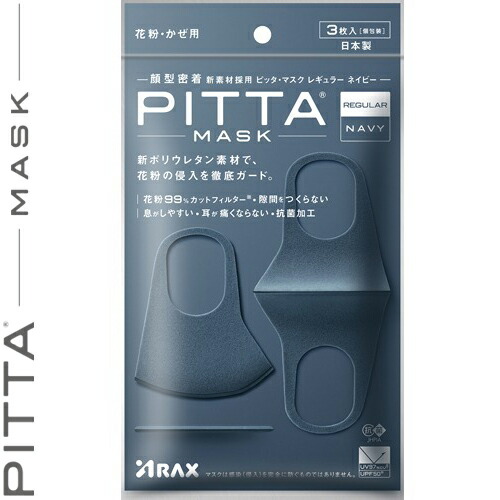 ピッタマスク ネイビー レギュラーサイズ 3枚 *アラクス/5回洗っても花粉99%カット/通気性高く息し易い/柔らかく伸縮性あり/顔に密着/花粉が侵入する隙間作らず長時間着けても耳が痛くならない/抗菌加工/マスク表面の菌の増殖を抑制