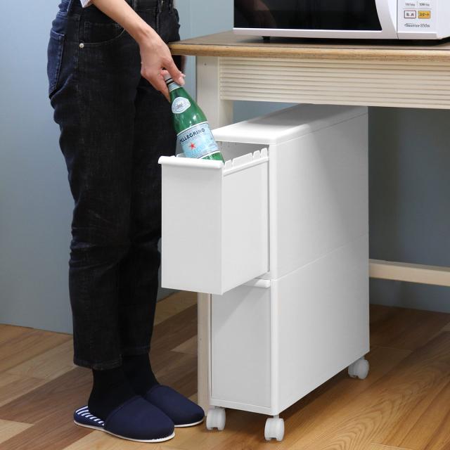 キッチンだけでなく、洗面台と洗濯機の間などでも使用可能で、ゴミ袋・洗剤・食品・ペットボトルなどの収納にもおすすめです。また、スリムなのでデスク下に設置して邪魔にならず、小物収納としてもお使いいただけます。