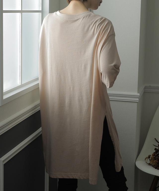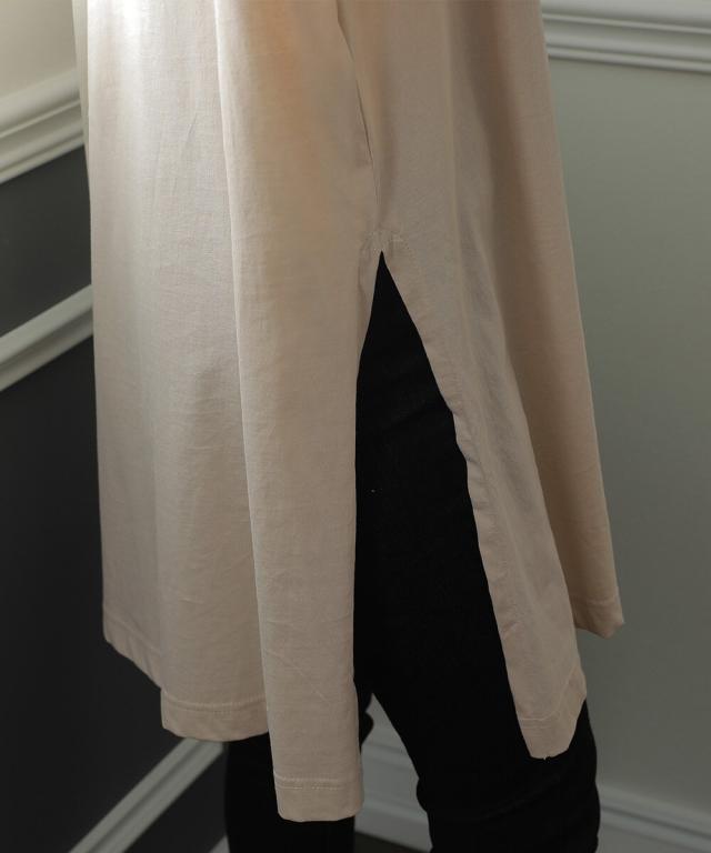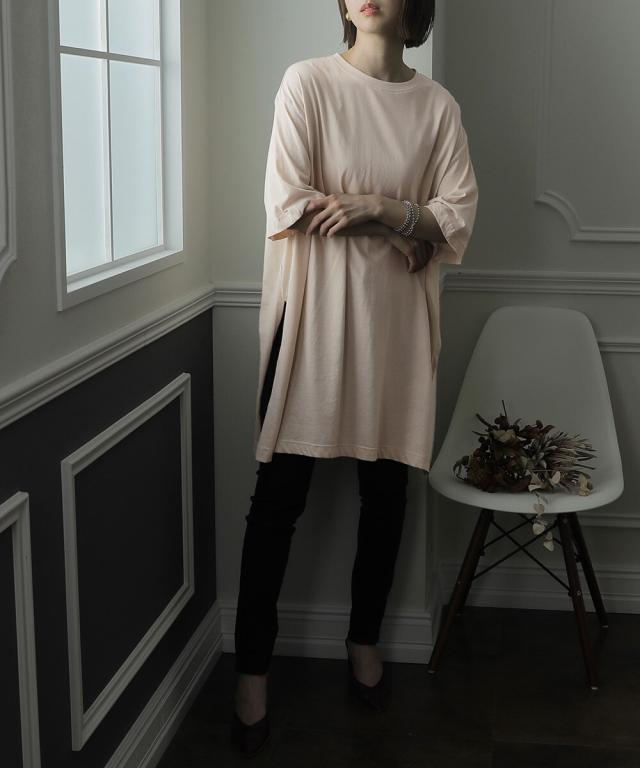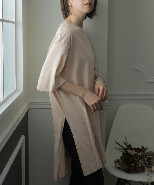 サイドスリットからボトムスが覗く抜け感あるデザイン。