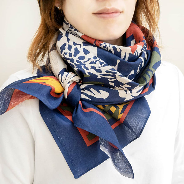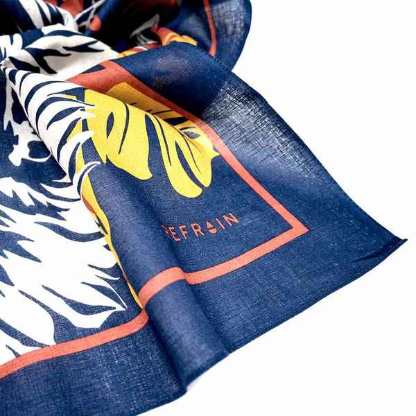 綿100%の天然素材なので通気性が良く柔らかな風合いなのでスカーフにしたり、肌寒い季節には肩からかけてストールがわりにするのもおすすめです。