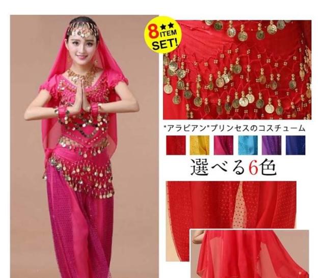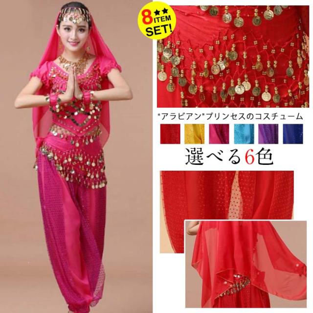 アラジン衣装/レディース/女性/半袖アラビア衣装/8点セット/ベリーダンス/ジャスミンコスチューム/レッスン着/ダンス衣装/ハーレムパンツ/舞台