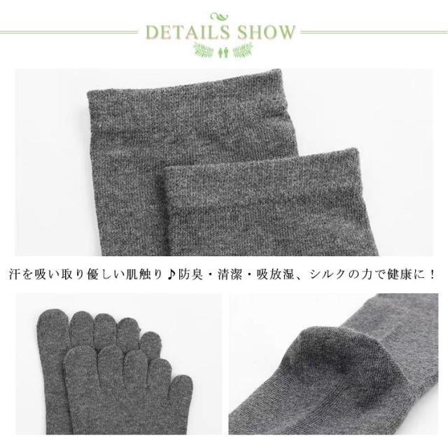 | さらりとした綿素材の五本指ショートソックス。 五指? 汗を吸い取り優しい肌触り♪防臭・清潔・吸放湿、シルクの力で健康に! 吸汗舒? 一本一本の指が独立しているので、指の間のムレ防止におすすめ。舒展脚趾 履き口の上部にゴム糸がないので、締め付け感がない。不勒脚 シンプルなデザインで、年齢問わず、男性を中心にお気軽に履いて頂けます。 ?? | |