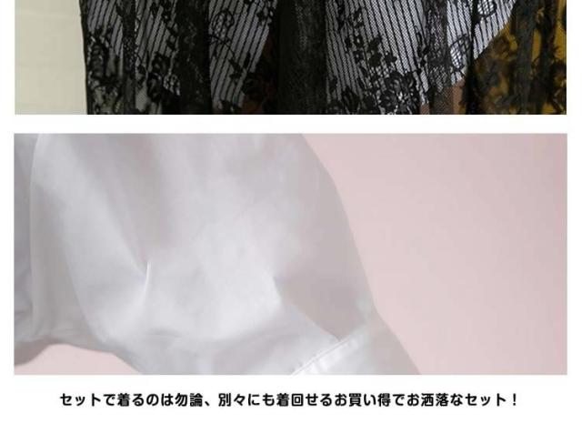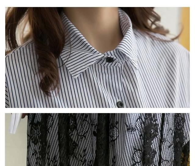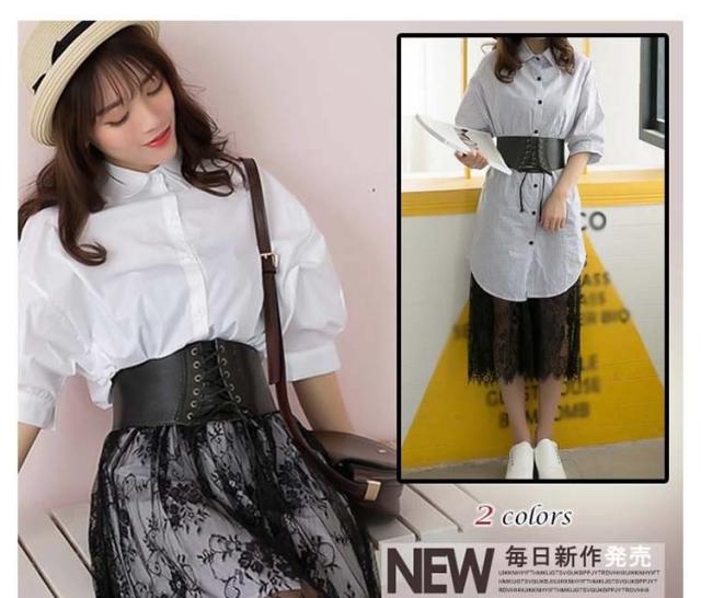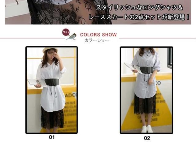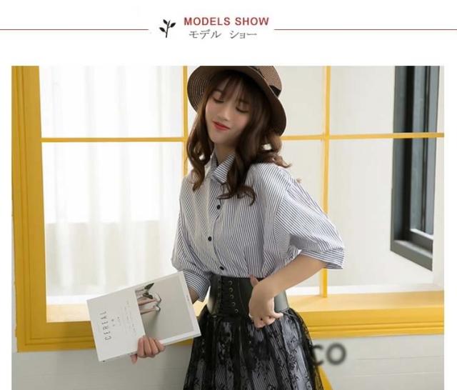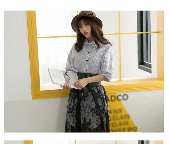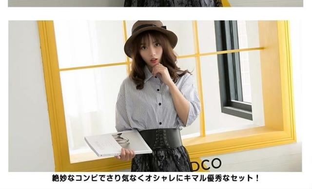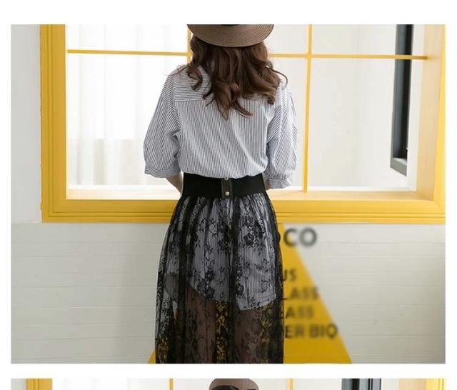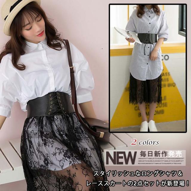 レディース セットアップ 上下セット 五分袖トップス&レーススカートの2点セット ストライプシャツ ワイシャツ 2017春新作