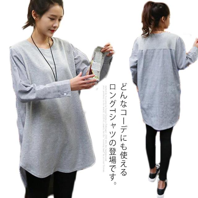 アシメトリーシルエット ロングtシャツ レディース tシャツ トップス ロング チュニック ストライプ切り替え ゆったり 体型カバー かじゅある 長袖 春服 秋服
