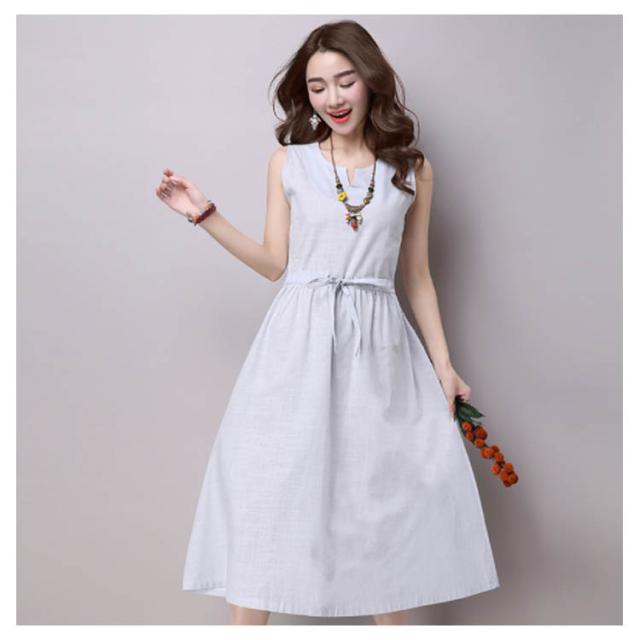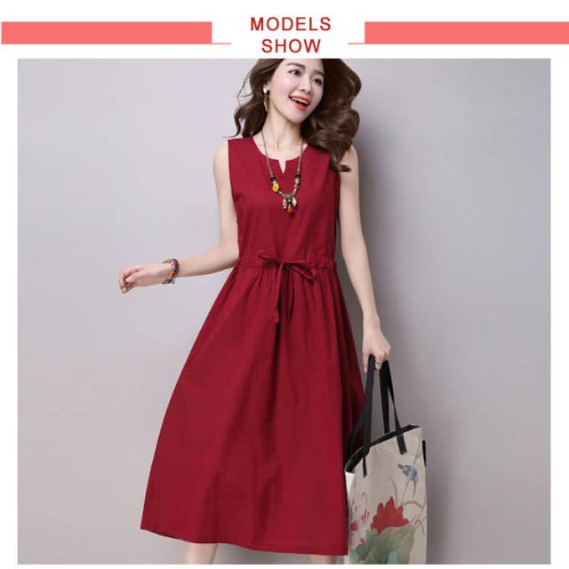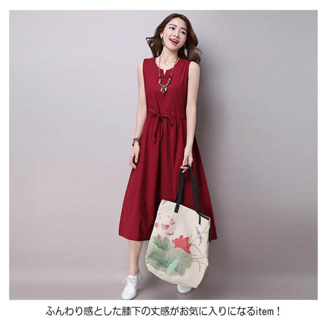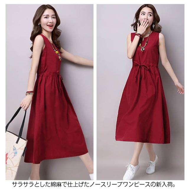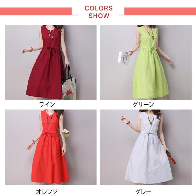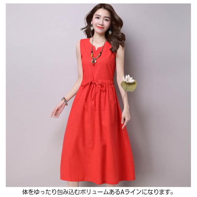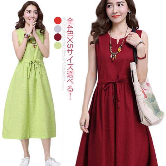 《》ワンピース リネンワンピース 綿麻 ノースリーブワンピース 夏ワンピース ロング丈 マキシ丈 膝下丈 ウエスト紐付き Aライン ロングワンピース シンプル 無地 ナチュラル 森ガール 夏