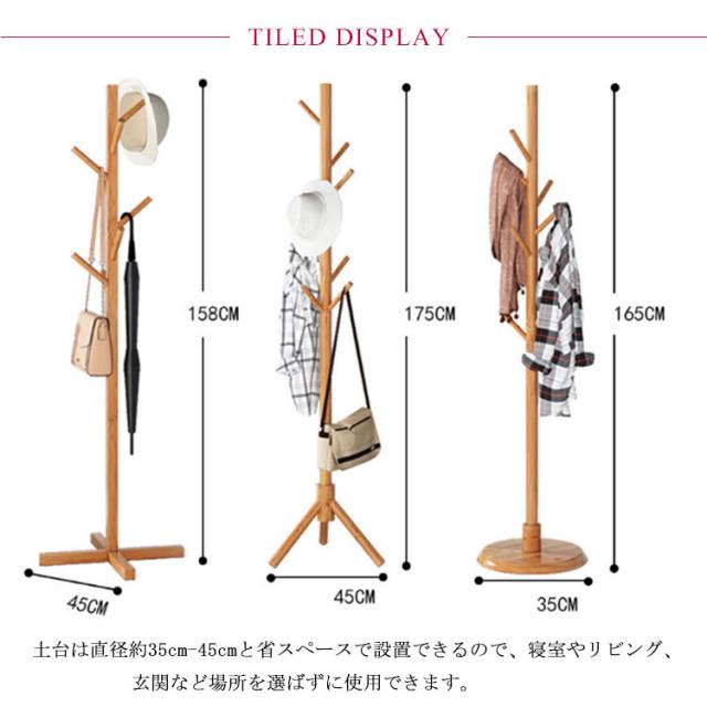 | 選べる3タイプ!竹制のおしゃれな洋服掛けのコートハンガーです。 バーの先端は帽子や繊細なストールを直接掛けても傷めにくく安心です。 バーはそれぞれが重ならないようになっているので、コートやバッグなどを一緒に掛けてもお互い邪魔になりません。 コートハンガーやバッグハンガーにも使えてとっても便利です。 土台は直径約35cm-45cmと省スペースで設置できるので、寝室やリビング、玄関など場所を選ばずに使用できます。 安定感はバッチリです◎ ※ご注意:素材感や色合いの表現には環境により色合いが異なる場合があります。予めご了承ください。 | |