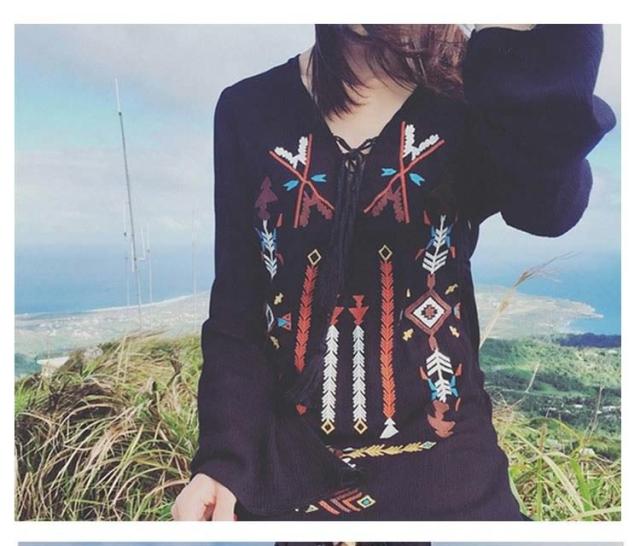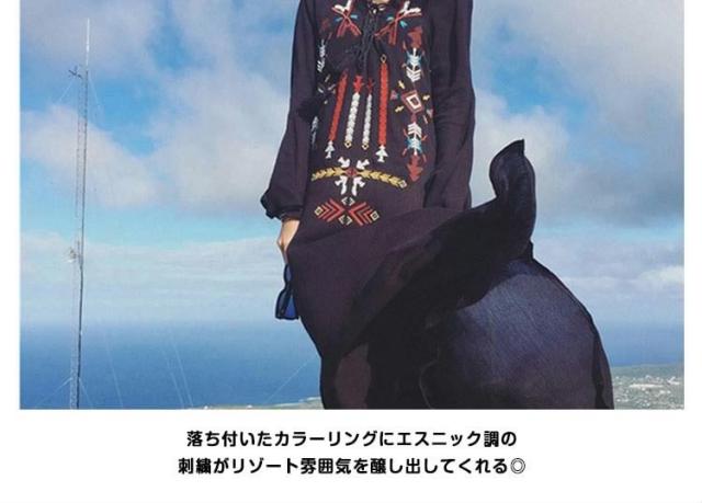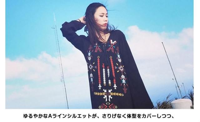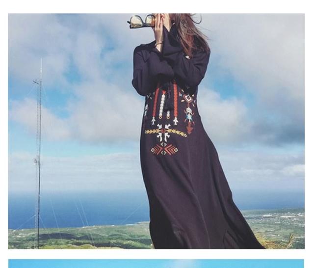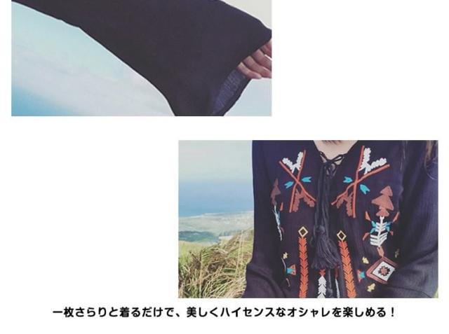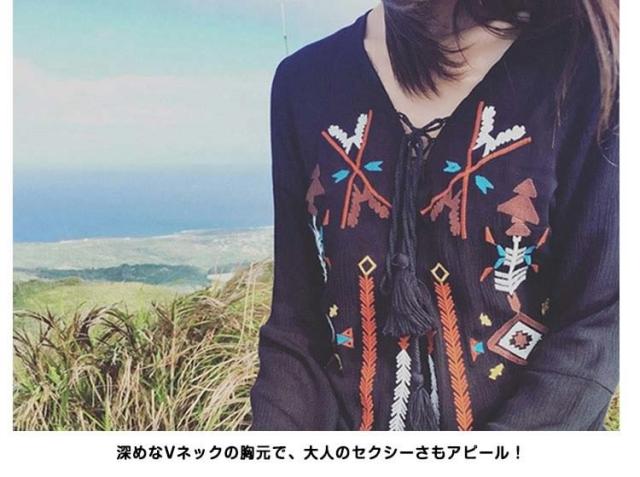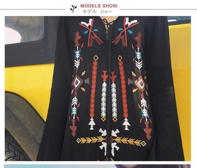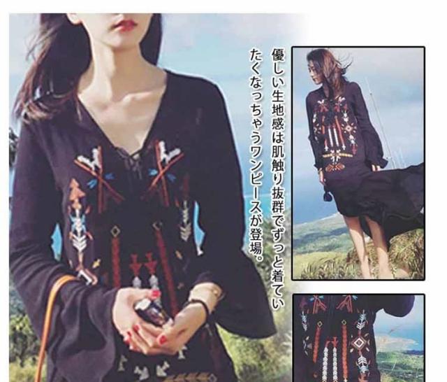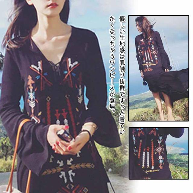 リゾートワンピ 長袖ワンピ ロングワンピ フレアワンピース レディース Vネック エスニック調 ボヘミアン風 サイドスリット 2017年春新作