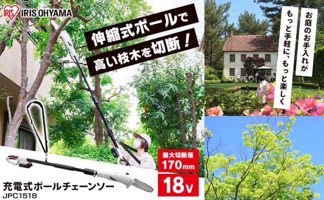 チェーンソー 充電式 電動ノコギリ 高枝チェーンソー 剪定 枝切り 太枝 高枝 伸縮ポール 1.46~2m 軽量 コードレス 18v 簡単操作 肩掛けストラップ 庭 園芸 のこぎり 電動 充電式チェーンソー ポールチェーンソー JPC1518 アイリスオーヤマ *