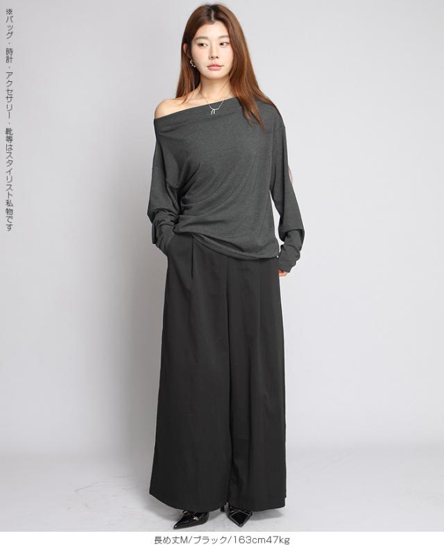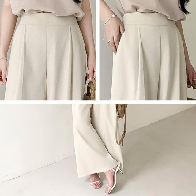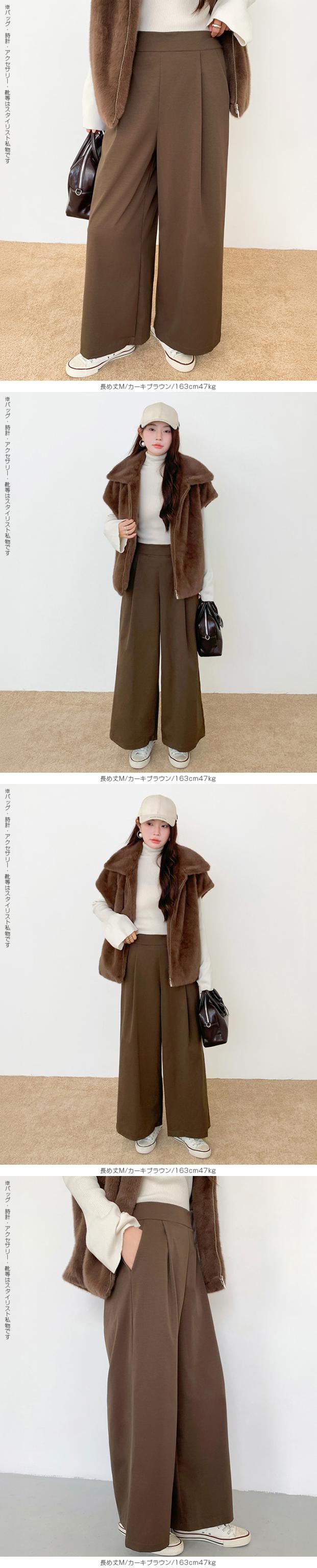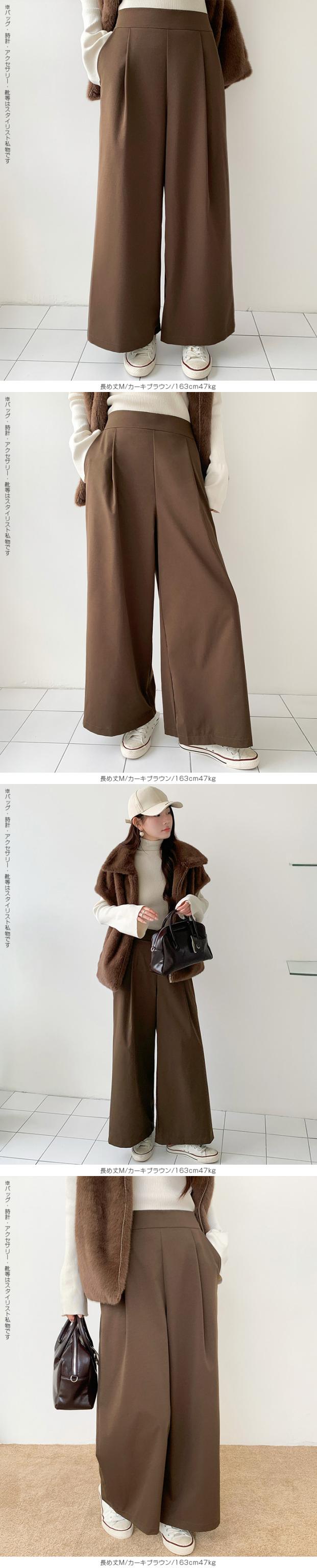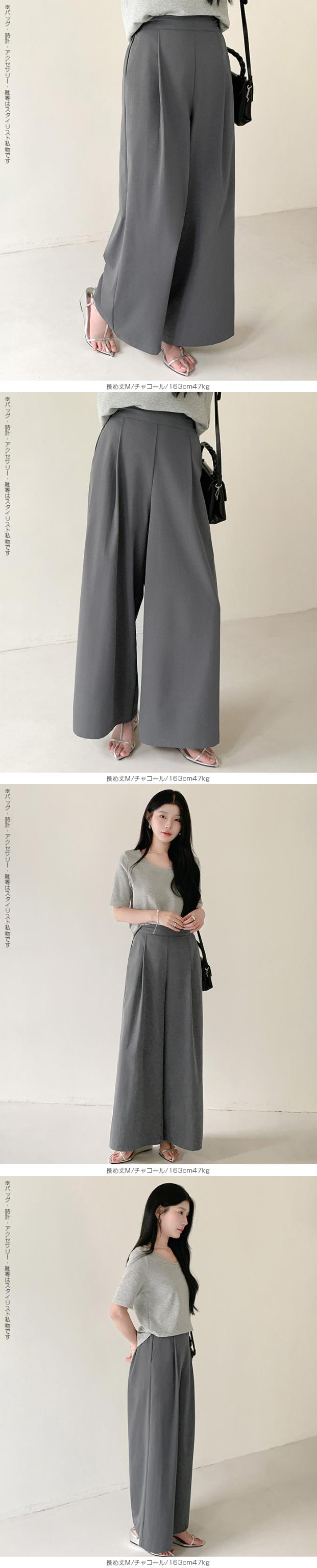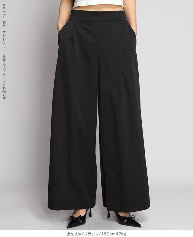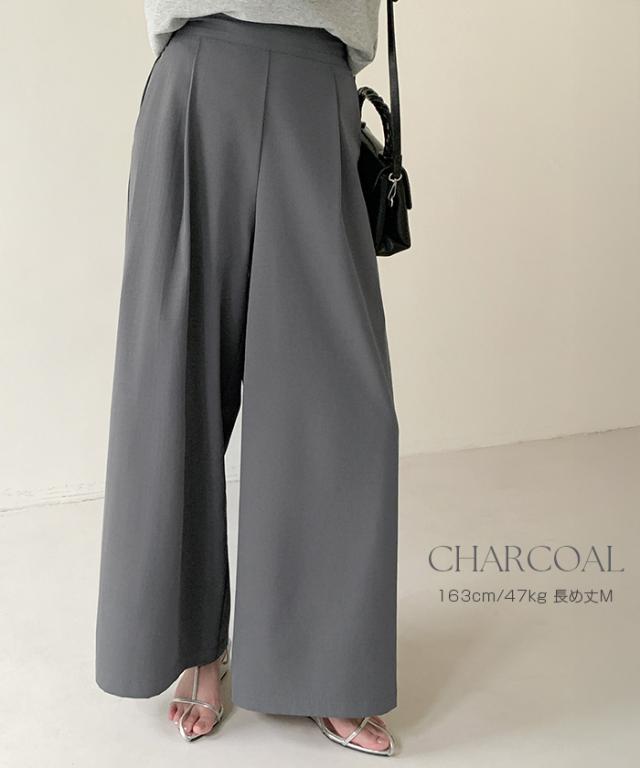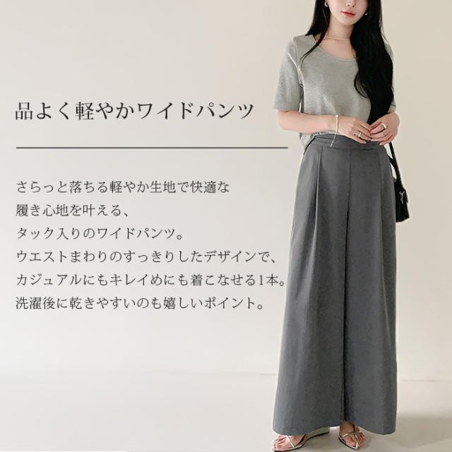 タック入りのワイドパンツ。