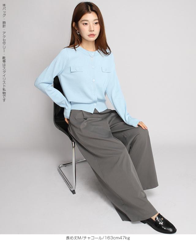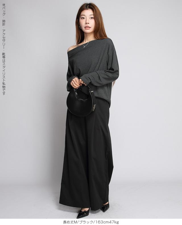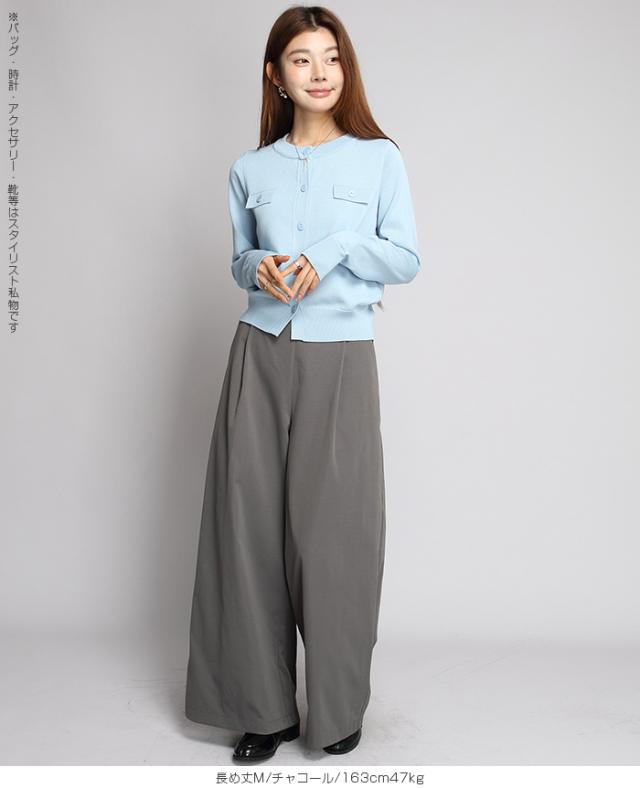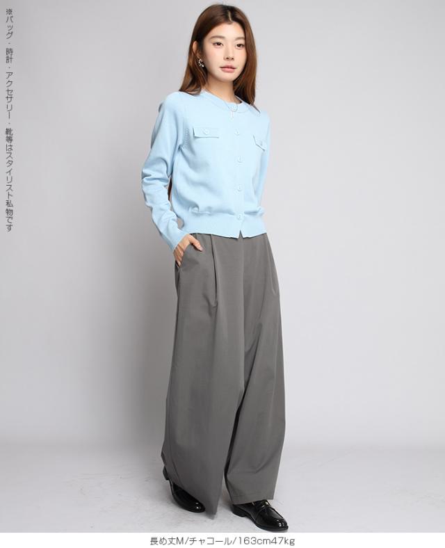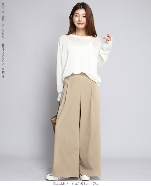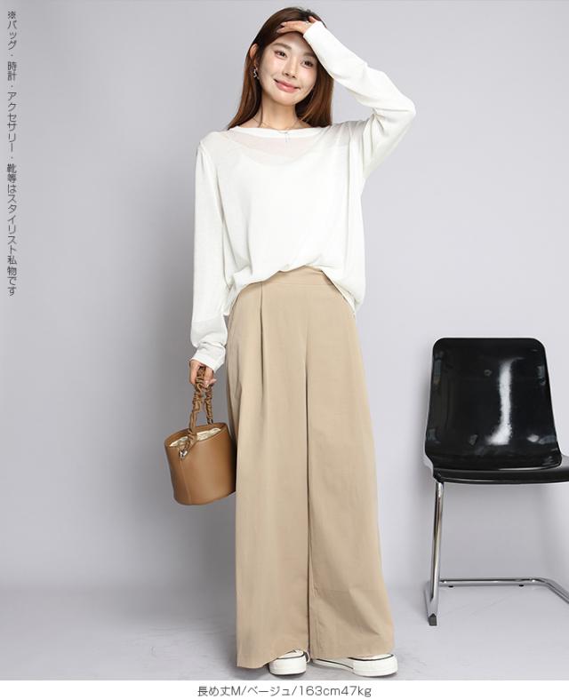 【 タック入りイージーフレアパンツ 】 すとんと落ちるシルエットで美脚を叶える、 タック入りのワイドパンツ。 柔らかくハリのある生地感と、 ウエストまわりのすっきりしたデザインで、 カジュアルにもキレイめにも着こなせる1本です。 夏場もサラッと軽い履き心地。涼しく快適に着用頂けます。 程よい落ち感と立体感があり、脚のラインを拾わず、 きちんと感も演出。 カラーと丈違いで揃えたくなる、着回し力抜群のアイテムです。 《商品ポイント》 タックで縦ラインを強調し、美脚効果◎ ストンと落ち感のある素材で体型を拾いにくい ウエストゴム仕様で履き心地もラク&きれい見え 3丈展開(短め・普通・長め)で身長や好みに合わせて選べる きれいめにもカジュアルにも合わせやすい万能パンツ 《デザイン・シルエット》 タック&ワイドライン タック入りで縦のラインを強調。 すっきり感を出しながら、 程よく広がるワイドシルエットが脚のラインをカバー。 腰まわりすっきり設計 フロントはフラットなデザイン、 後ろゴム仕様で美しさと快適さを両立。 スタイルアップが叶う設計 ヒール合わせで脚長効果抜群。 ぺたんこ靴でもバランスよく決まる絶妙な丈感。 《サイズ・カラーバリエーション》 サイズ:普通丈M / L 長め丈M / L カラー:ブラック グレイッシュベージュ ネイビー チャコール ベージュ カーキブラウン 《素材・機能性》 ・素材:ポリエステル100% ・透け感:淡い色のみ透け感あり ・伸縮性:なし ・厚み:普通(春〜秋に◎) |