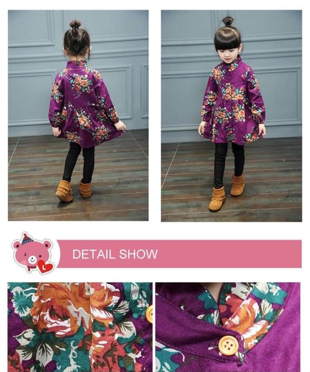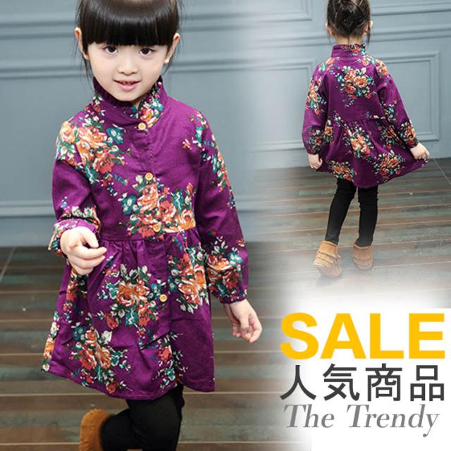 送料無料ワンピース 長袖 プリント 花柄 スタンドカラー チュチュ チュール 子供服 花飾り ショート丈ワンピース 長袖 中国風 ベビーワン