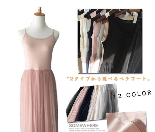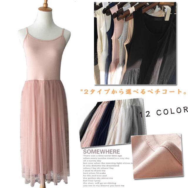 | 2タイプから選べるペチコート。タンクトップタイプとキャミソールタイプをご用意、コーデに合わせてお好みのタイプをチョイス。ウェストチュールスカート切替で、インナーに最適のドッキングワンピース。カジュアルにも綺麗めにも◎合わせるアイテム次第着まわし力抜群ニットやパーカー、デニムジャケットとレイヤードしても可愛いテーラードジャケットとコーデすれば、絶妙な甘辛テイスト♪ | |