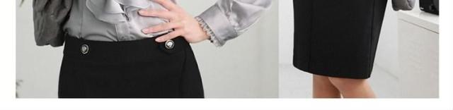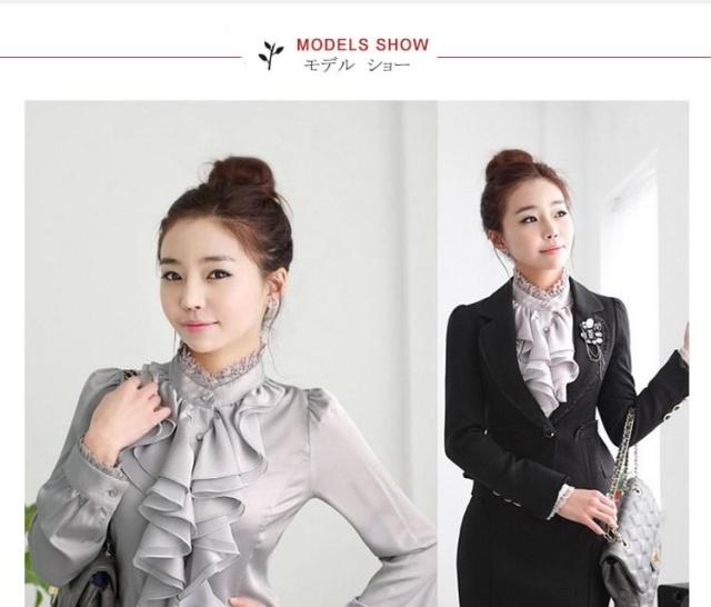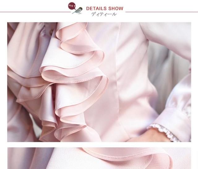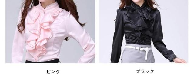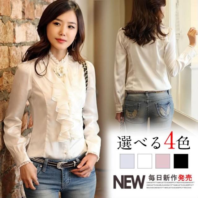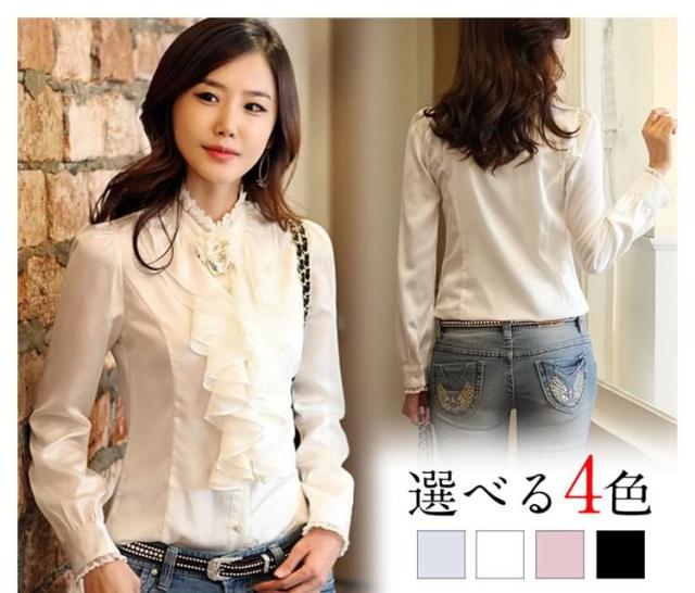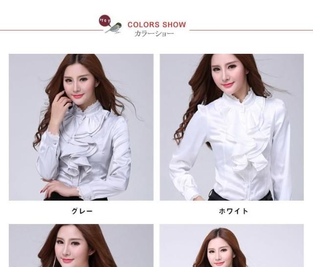 送料無料シャツ ブラウス 無地 長袖 OL風 レディース スリム フリル襟 トップス インナー 無地 シンプル レース飾り リブ袖 フォーマル