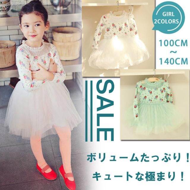 送料無料子供ワンピース 切り替え レース ドッキング キッズワンピース レースネック 花柄 子供服 秋冬 子供 ワンピース 長袖 入