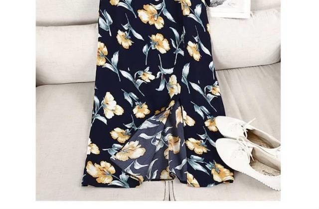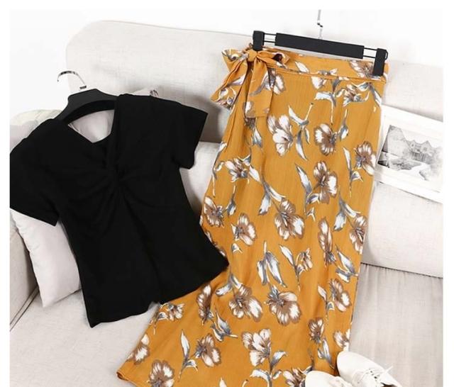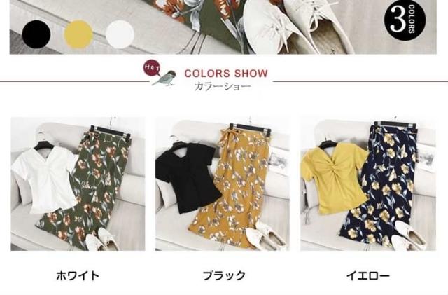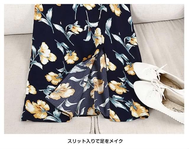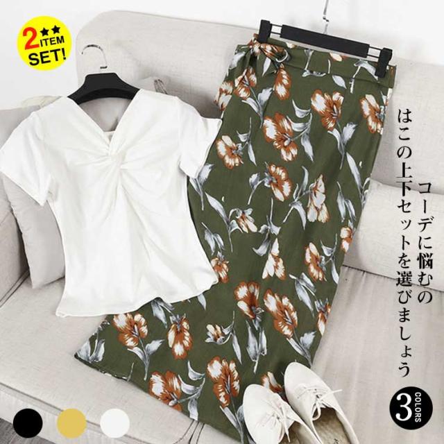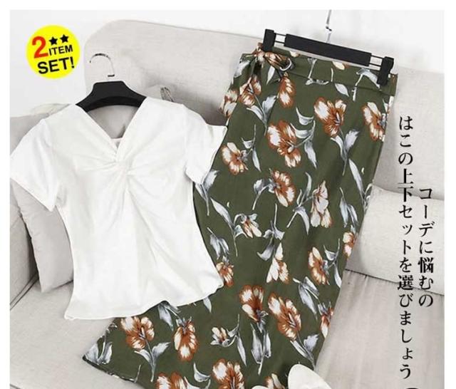 得な上下セット!Tシャツ ロングスカート 花柄 スリット入り