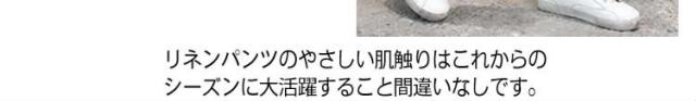 | カジュアルなムードを漂わせる大人女子必見の一本をご紹介。リネンパンツのやさしい肌触りはこれからのシーズンに大活躍すること間違いなしです。ウエストはヒモで調節可能なのも嬉しいディテールのPOINTです。気負わず自然体でいられるので部屋でのリラックスタイムなどシーンを問わずに大活躍! | |
