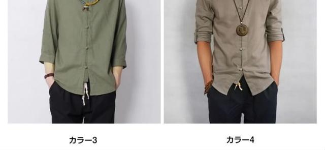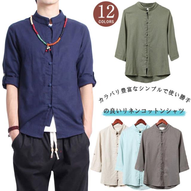 チャイナ服 シャツ メンズ 7分袖 立ち襟 リネンシャツ アジアン 無地 トップス リラックス ゆったり