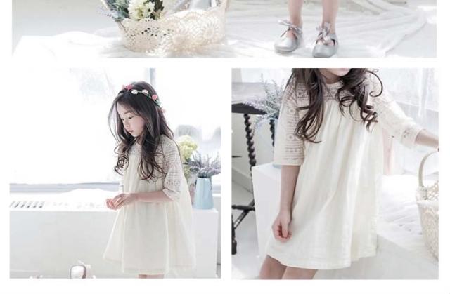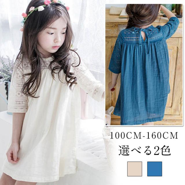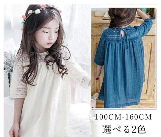 送料無料チュニックワンピース 5分袖 クルーネック ゆったり レース切替 透かし感 子供服 ワンピース 無地 シンプル ホワイト キレイ目